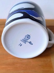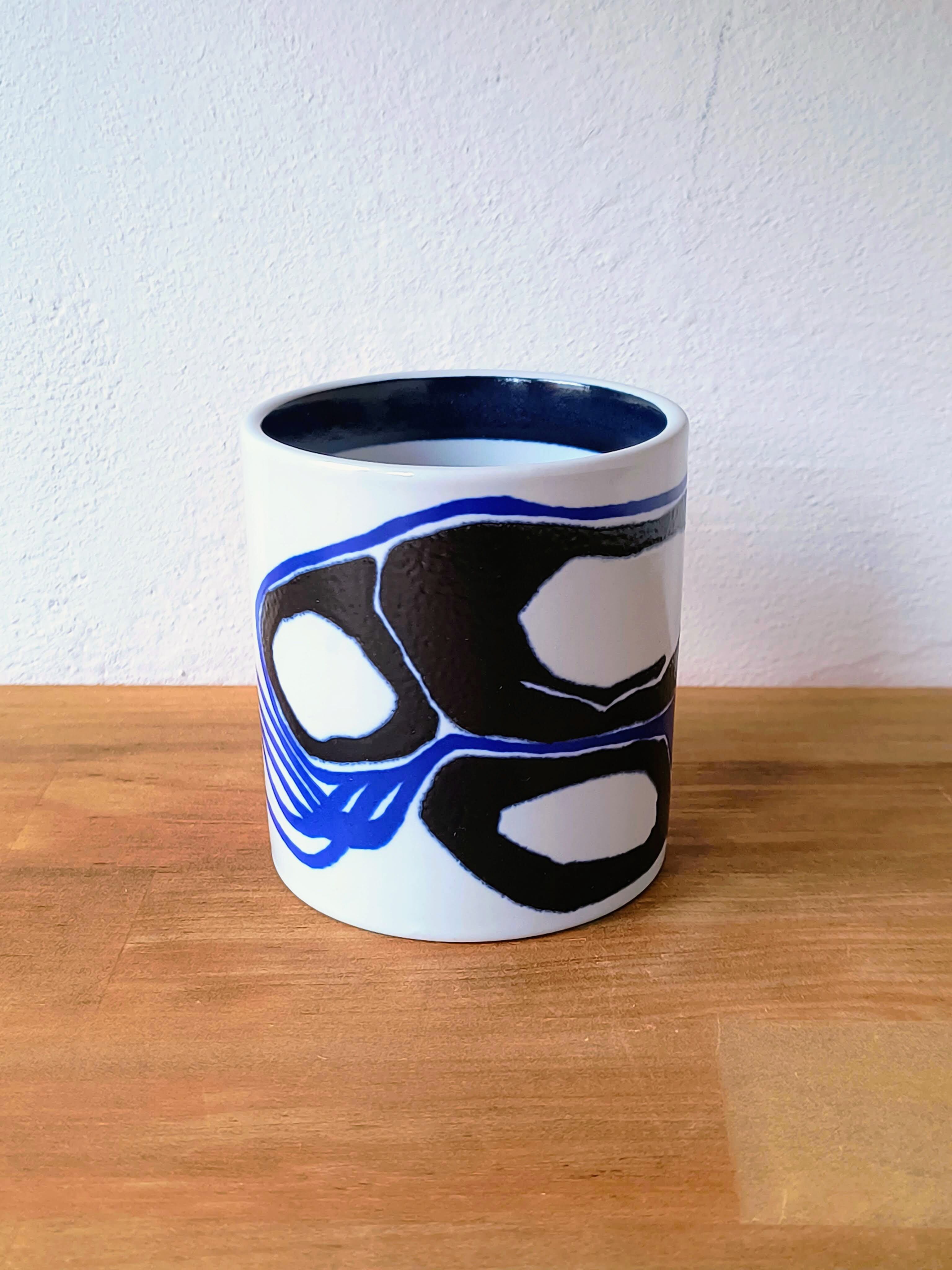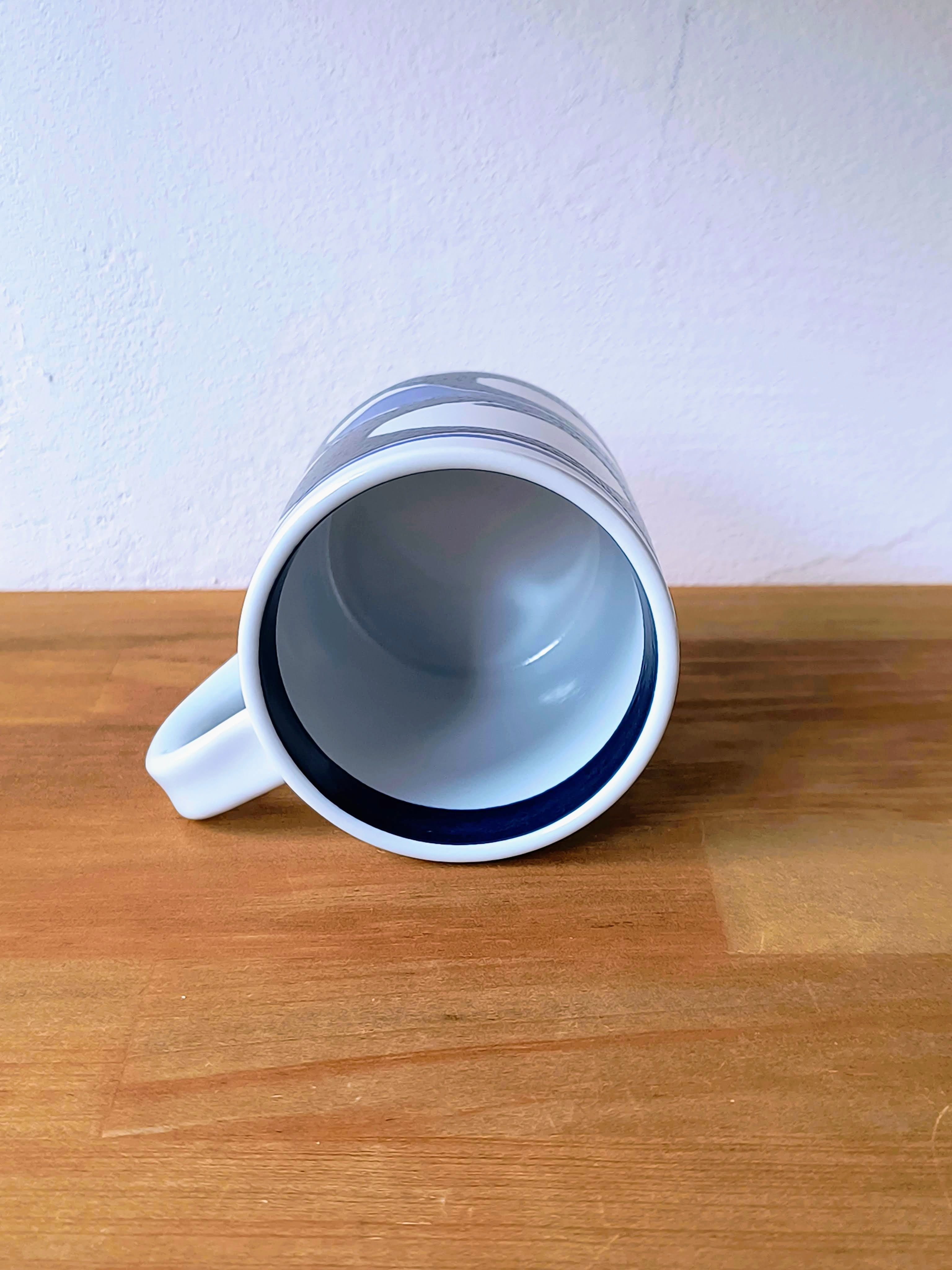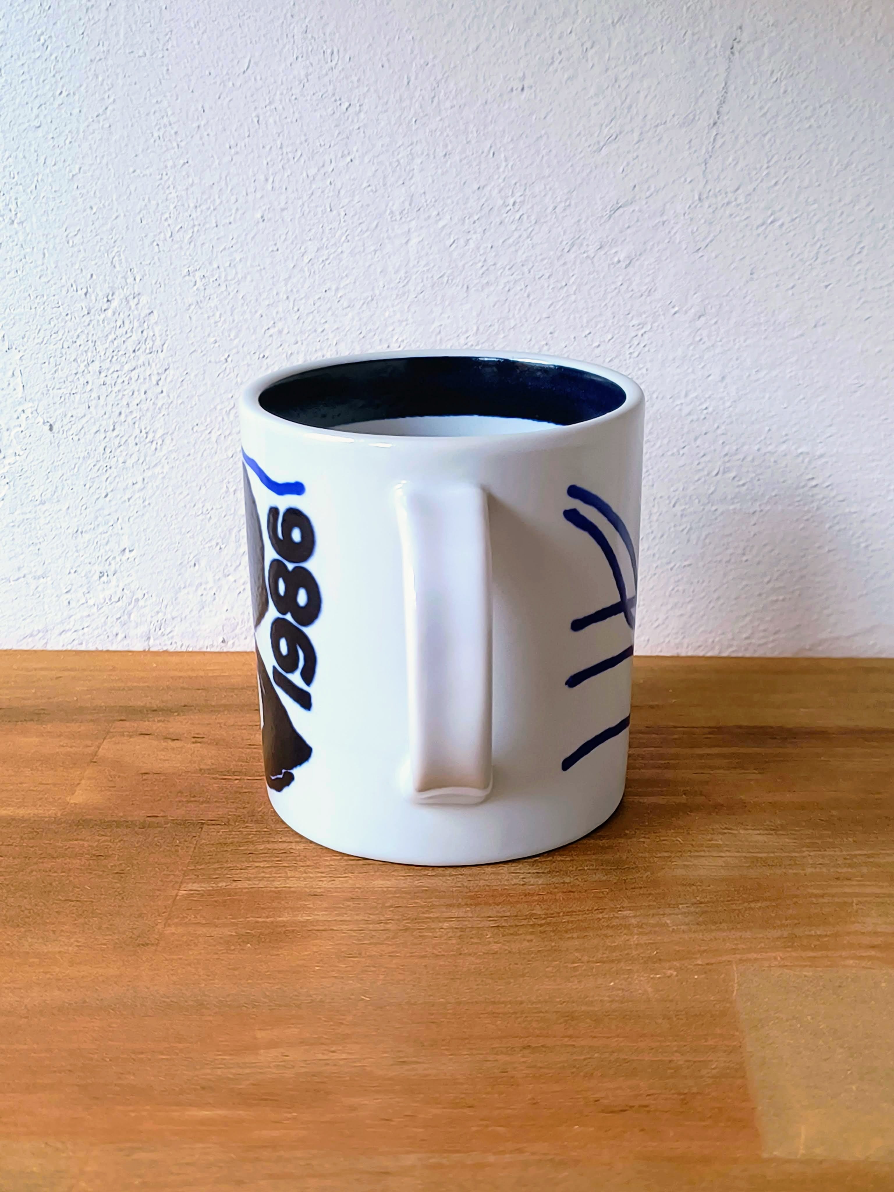 1980年代後半のマグの中でも特にダイナミックな表現が光るこの作品は、見る者に強いインパクトを与えます。白の素地に、ブランドカラーである深いブルーと、圧倒的な存在感を放つブラックが、大胆な曲線で絡み合うように描かれています。