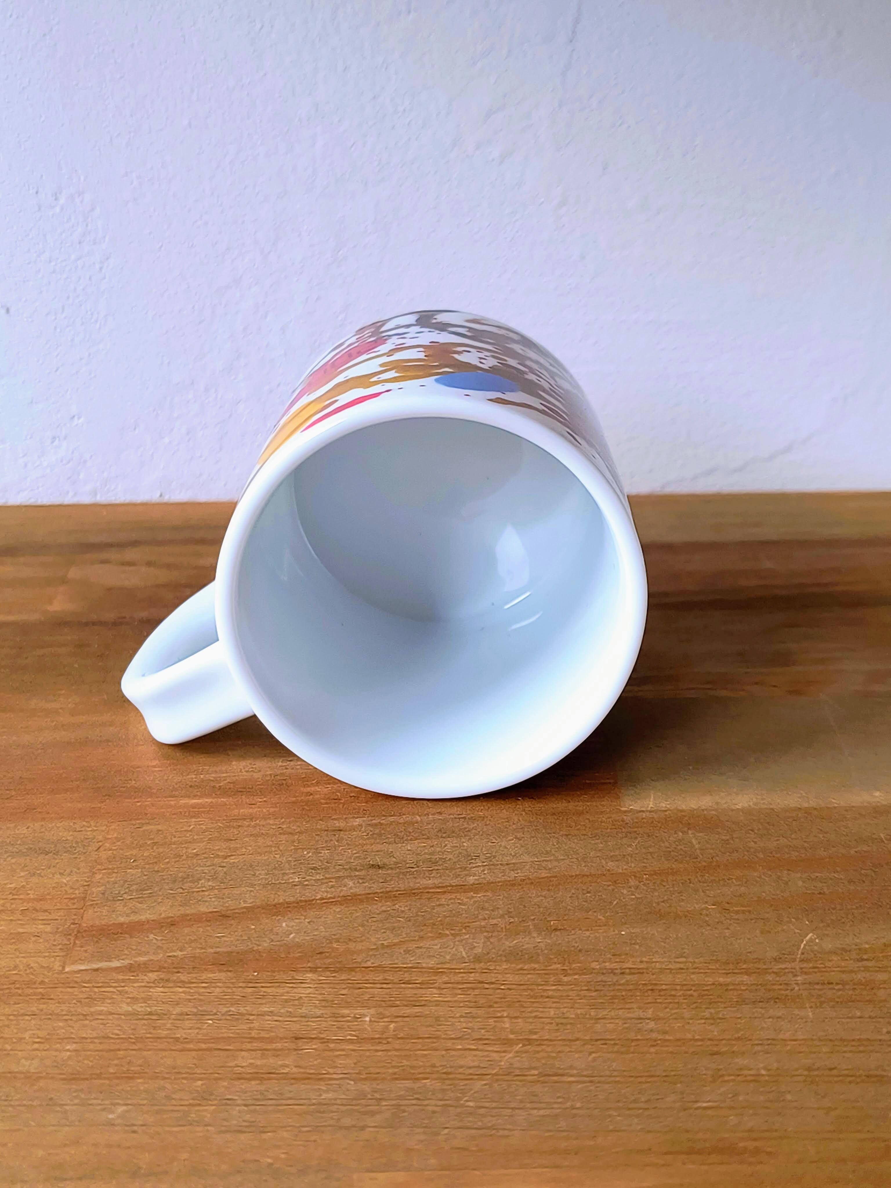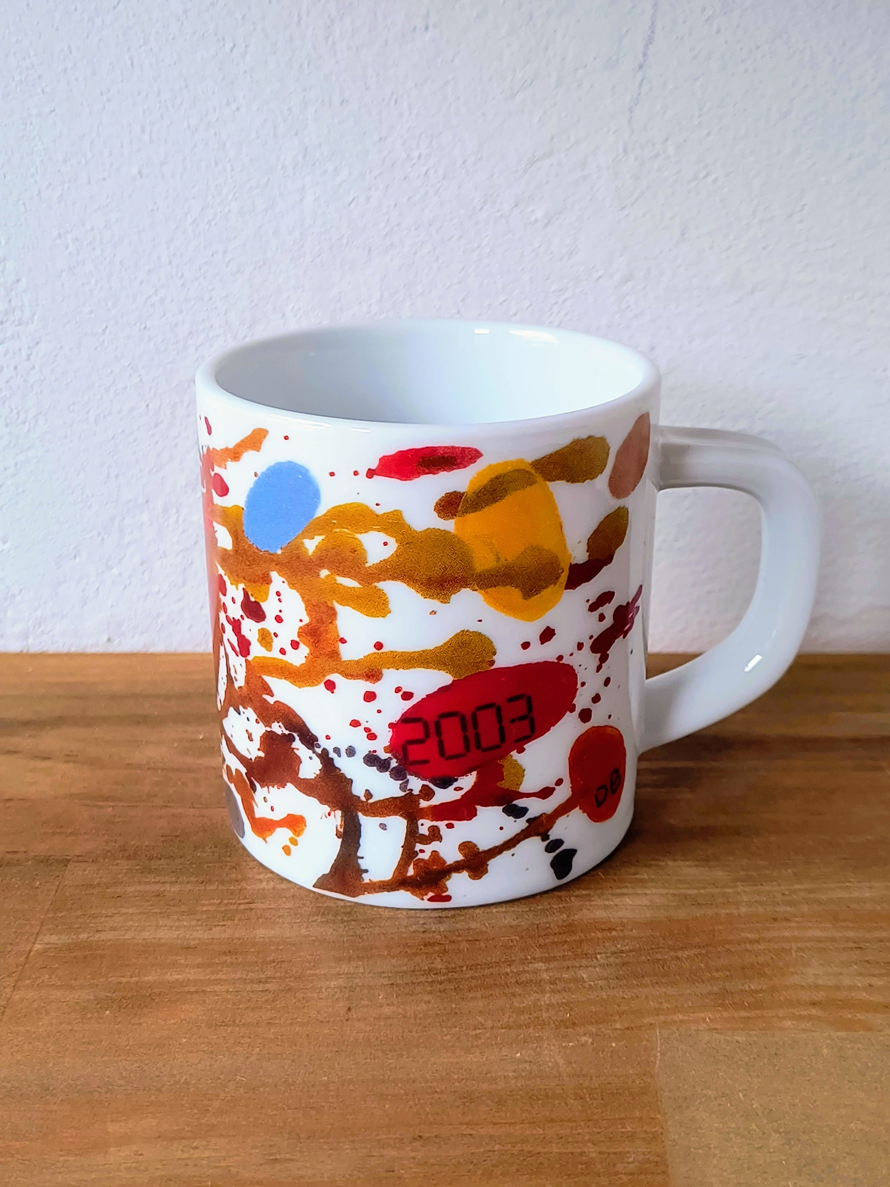 2000年代のイヤーマグは、伝統からさらに踏み出し、モダンで実験的なデザインを取り入れています。この2003年の作品は、白い素地いっぱいにカラフルなインクが飛び散ったようなスプラッシュ・ペイントが特徴的です。