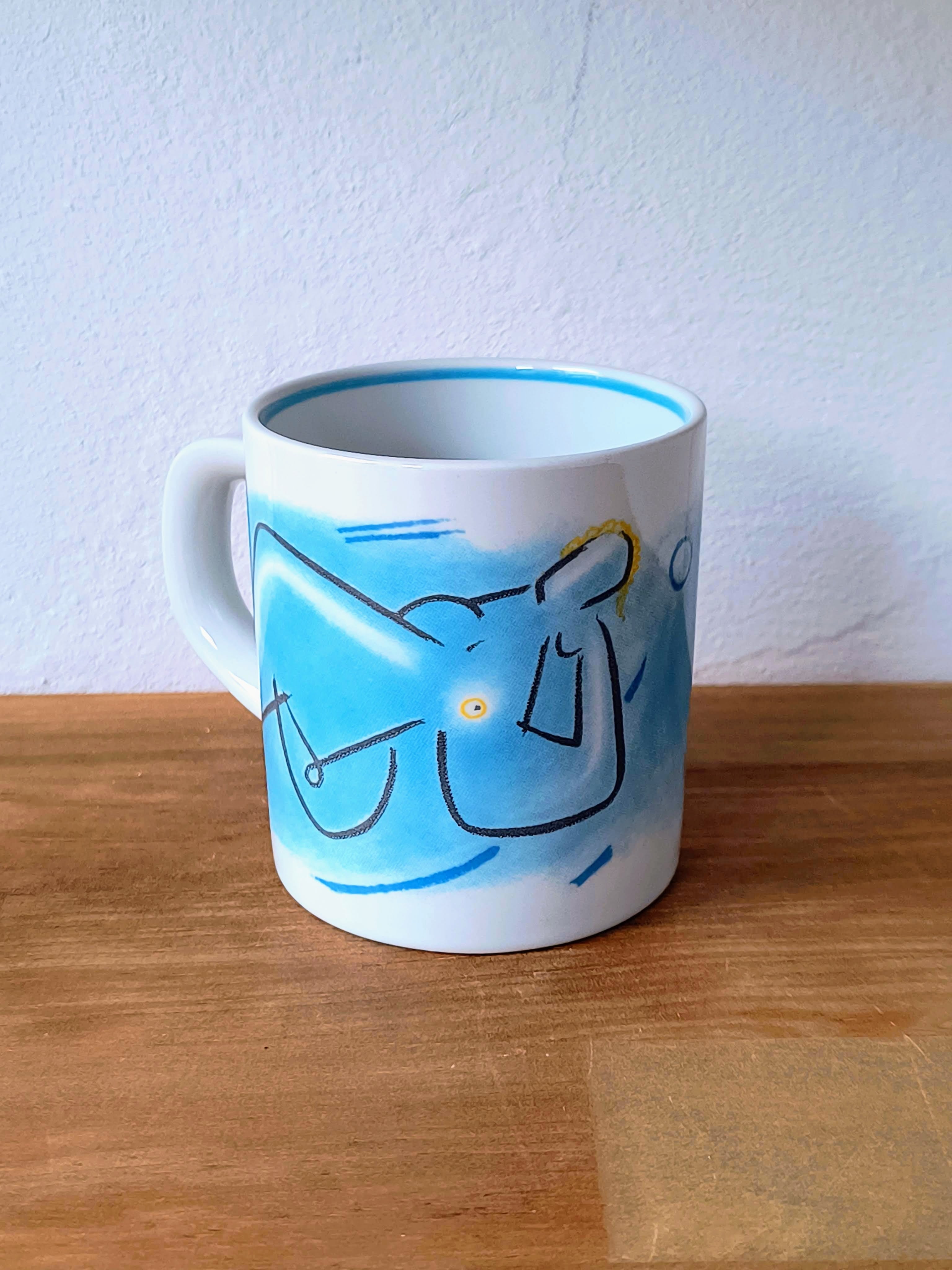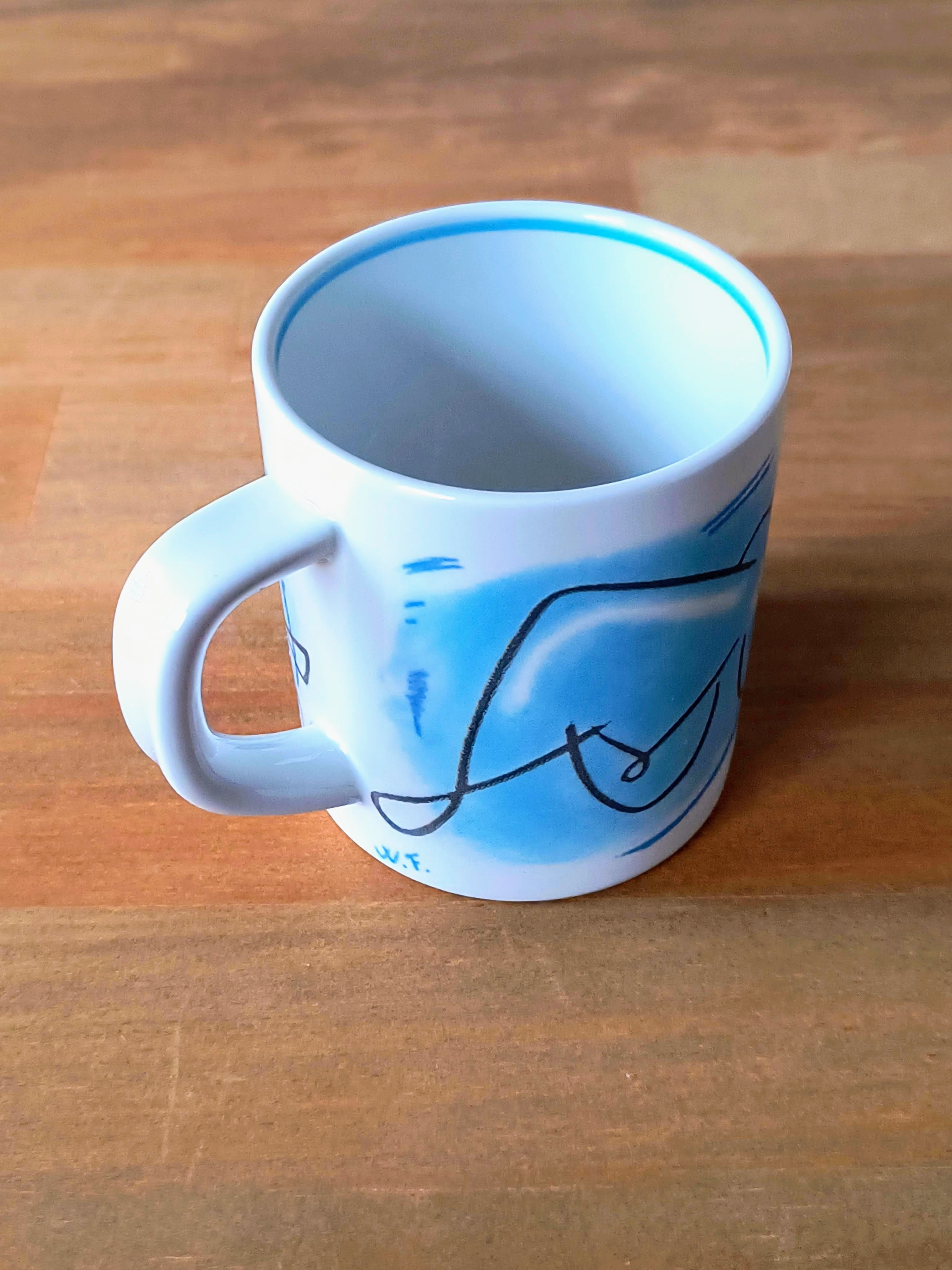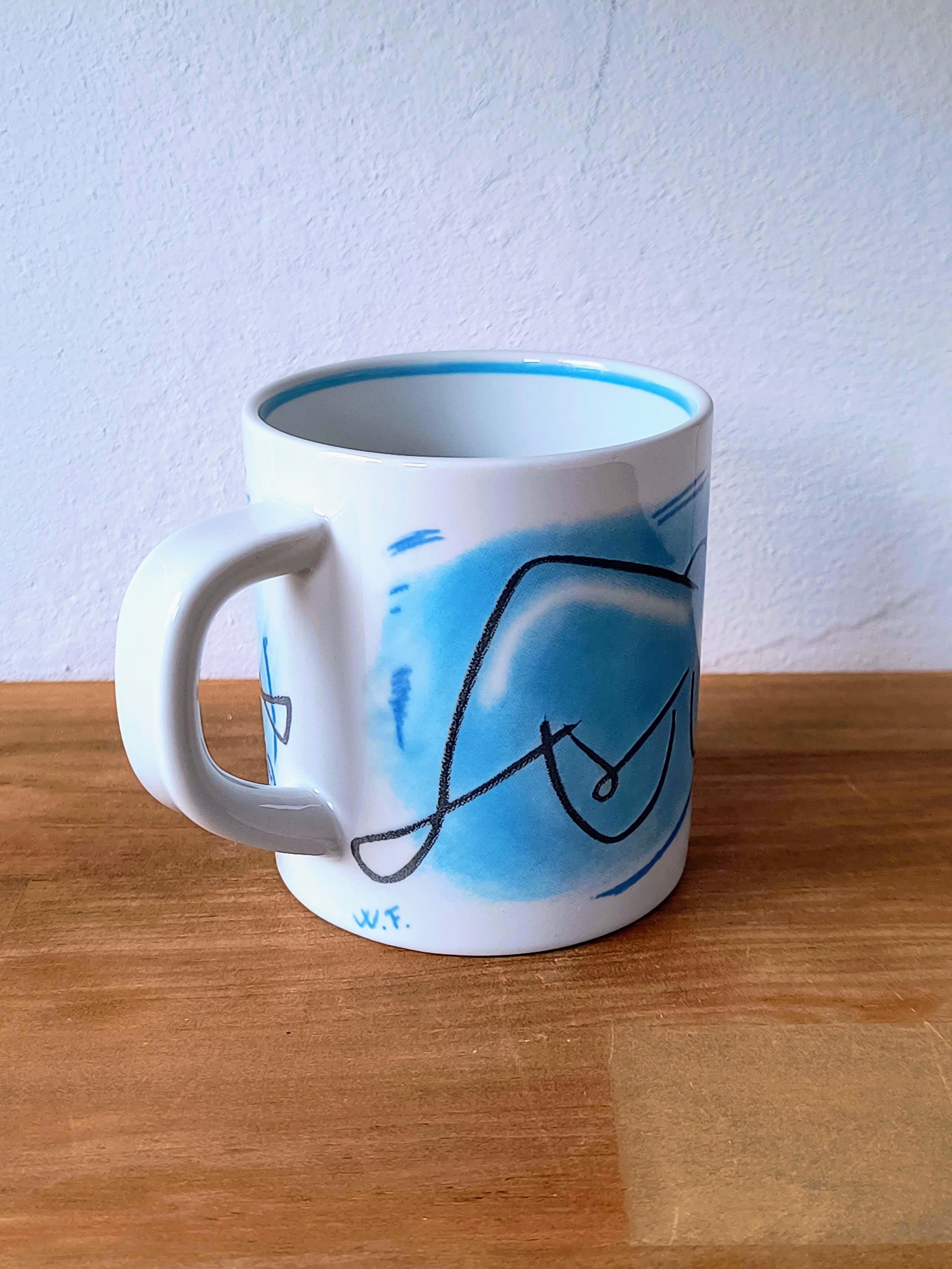 リラックスしたポーズの身体が、淡いブルーと明るいイエローの抽象的な背景に描かれています。このミニマルで詩的な表現は、日常のマグカップという枠を超え、まさにアートピースとして楽しめます。