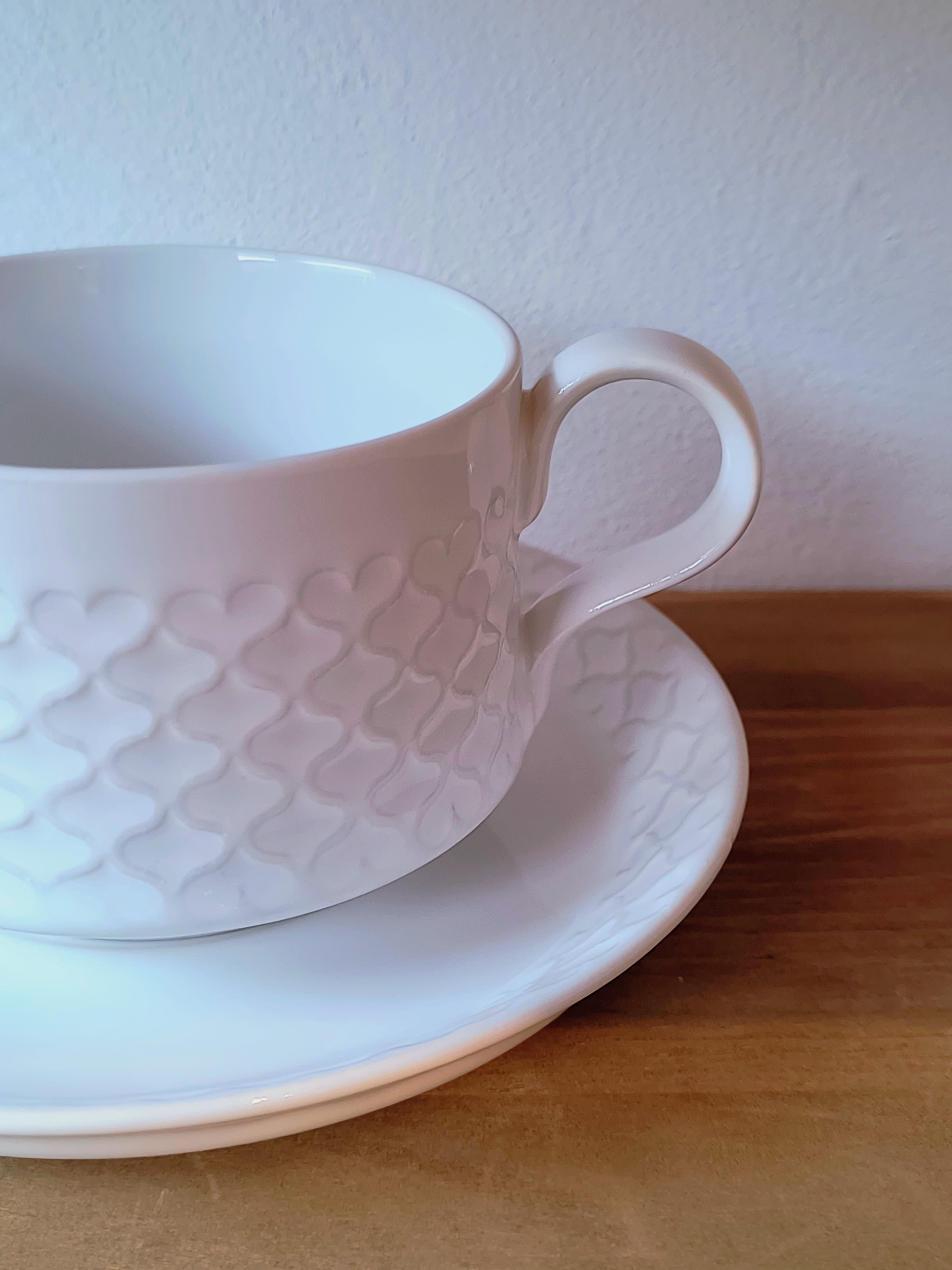 シリーズ名の"Cordial"は「真心」を意味し、カップ全体を覆うハートモチーフの浮き彫り(レリーフ)は、クイストゴーの温かさに満ちたデザイン哲学を象徴しています。