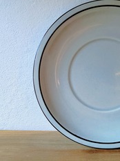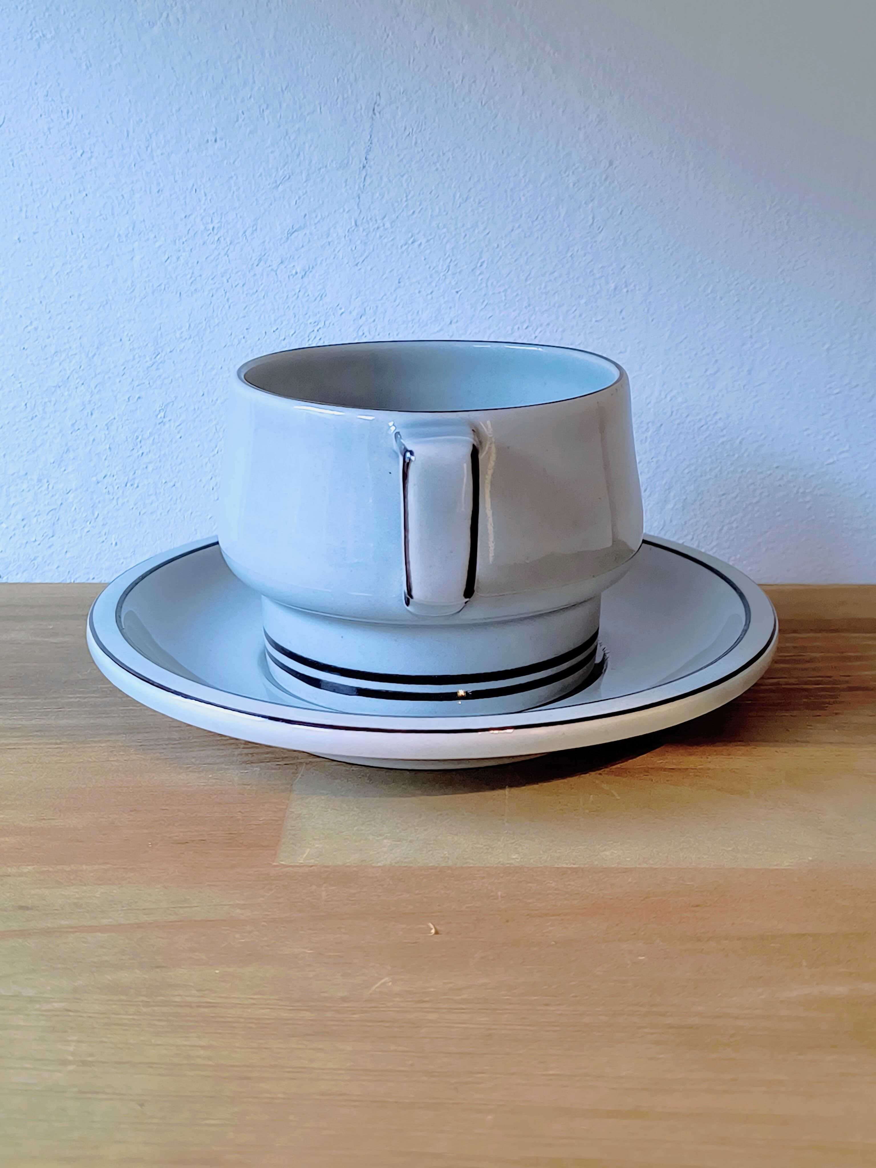 グレーがかったオフホワイトのシックな色合いに、カップの中央とソーサーの縁に施されたシャープな黒のラインが全体を引き締めます。直線的なハンドル(持ち手)も相まって、大人のモダンな雰囲気を食卓にもたらします。