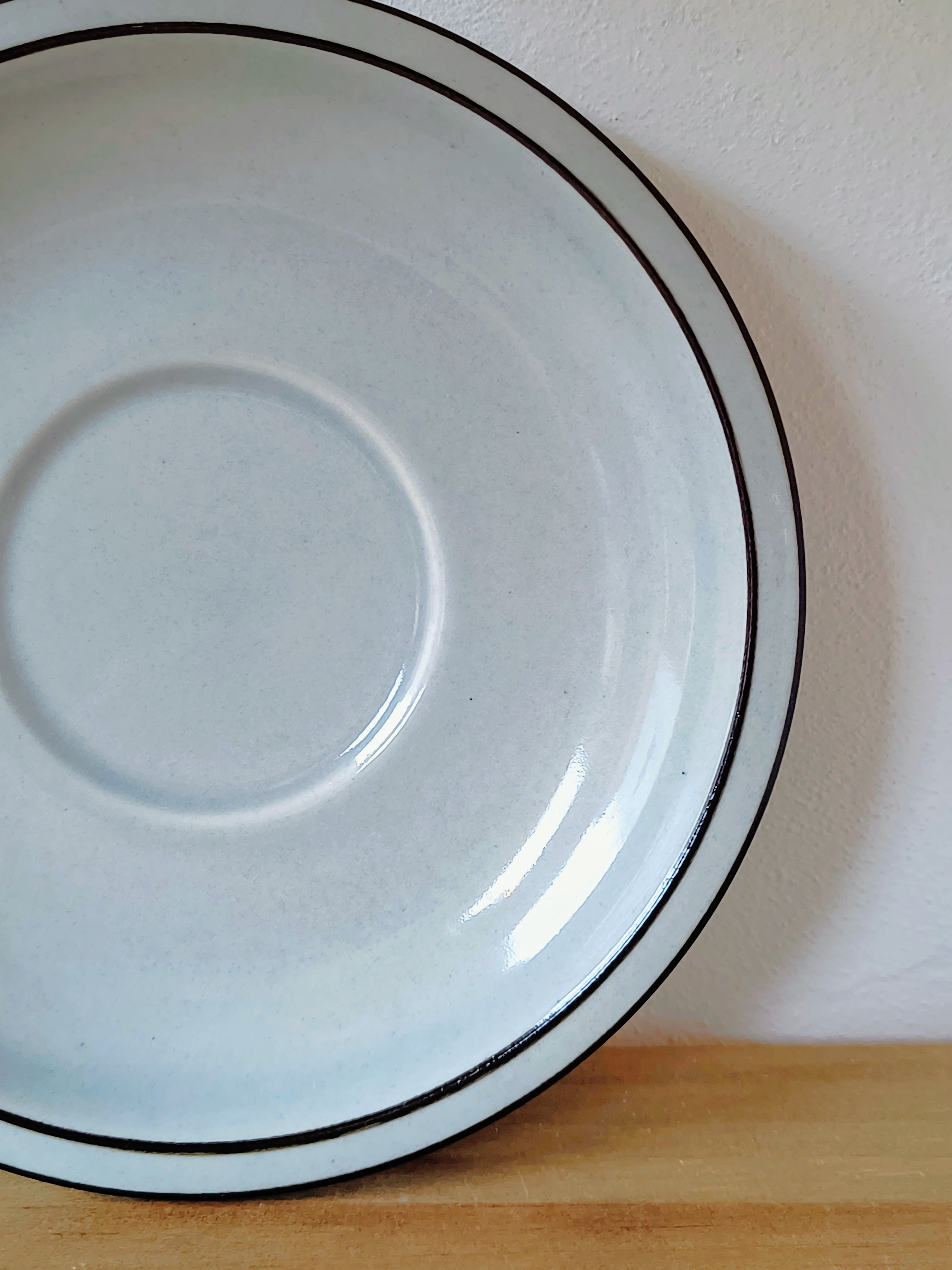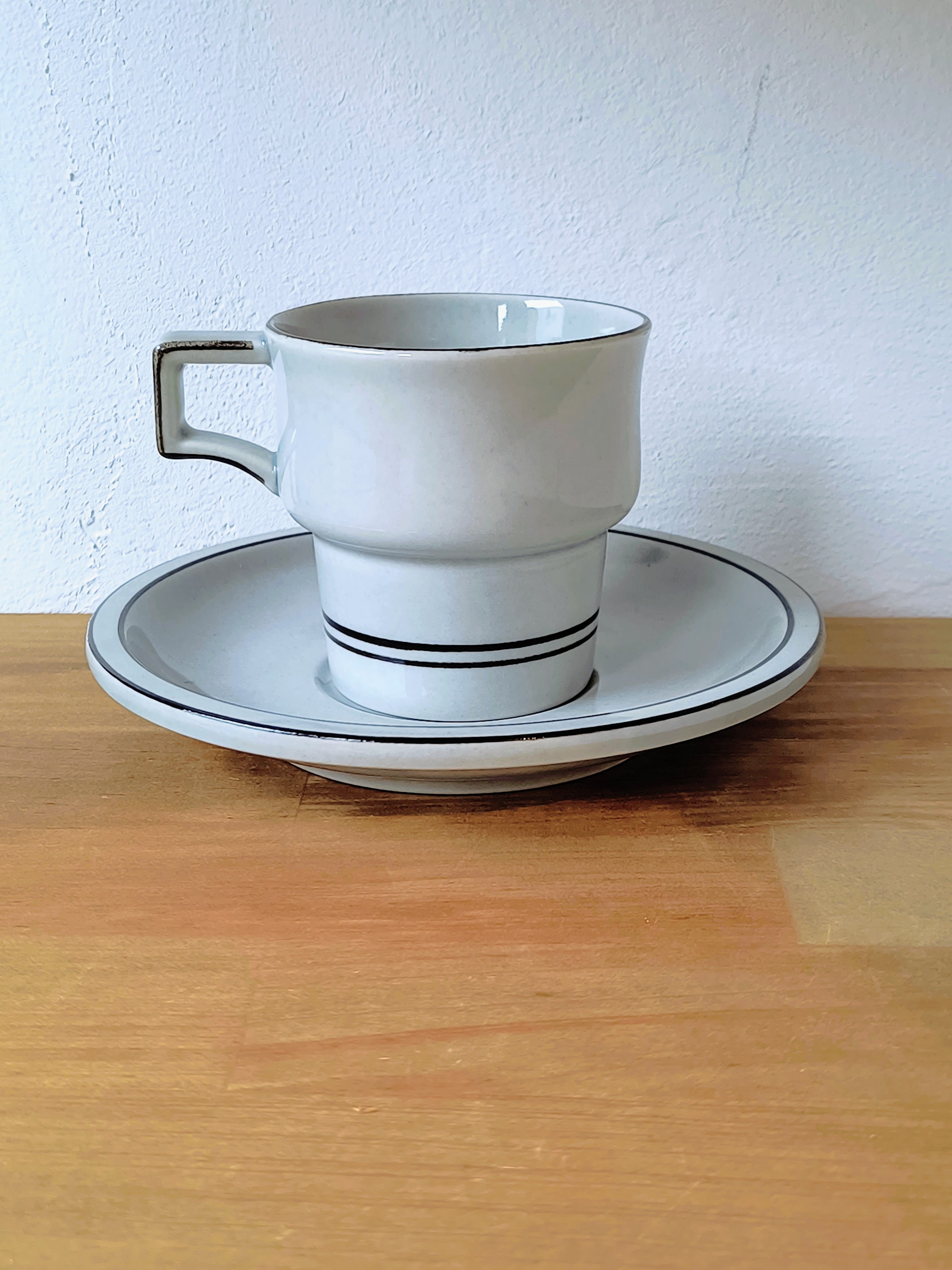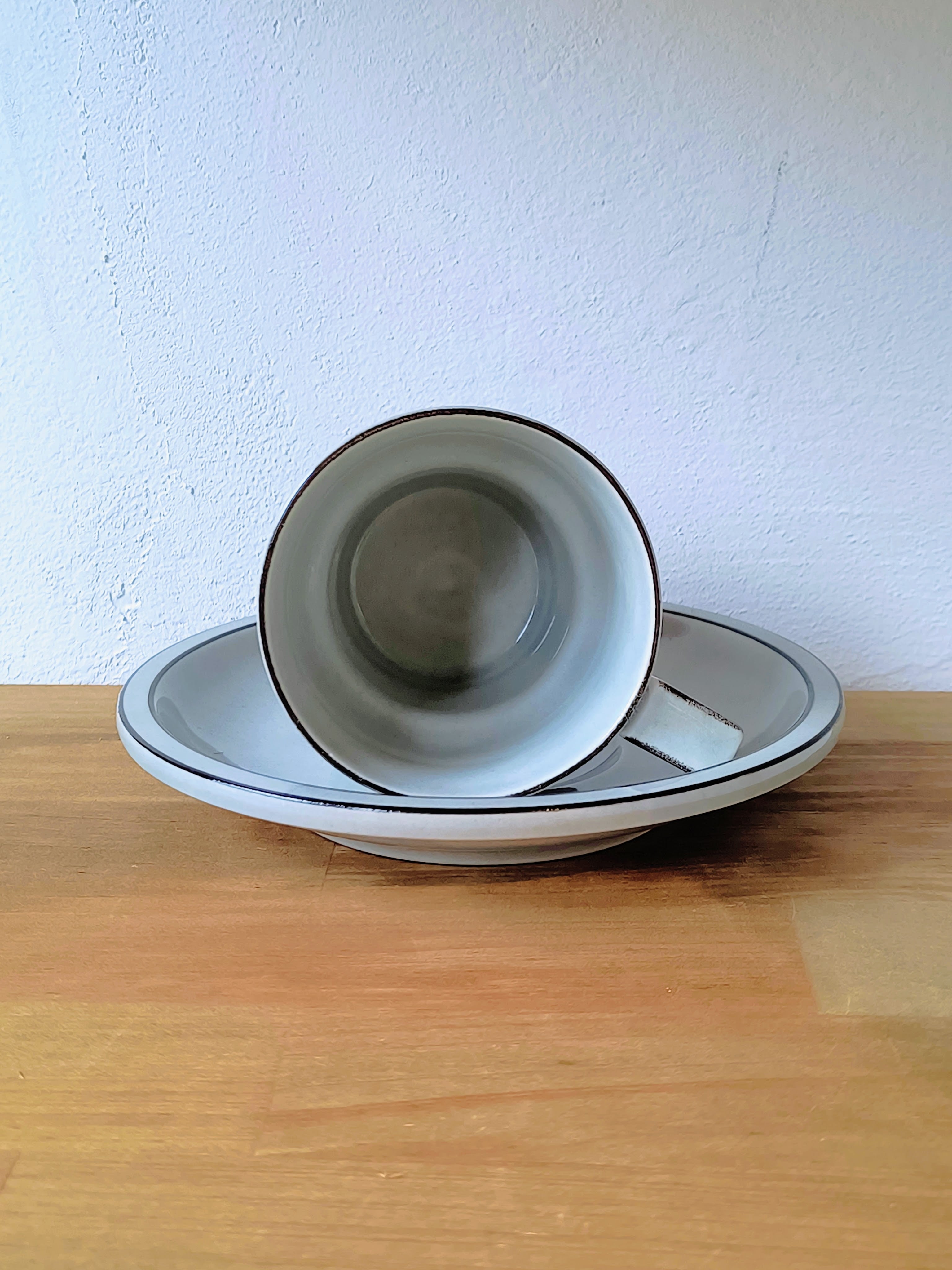 コロンビアシリーズの魅力は、何と言ってもそのシンプルで端正な佇まいにあります。無駄を削ぎ落としたフォルム、わずかにグレーがかったニュアンスカラーの素地、そしてカップとソーサーに控えめに施されたダークグレーのライン。これは、派手さはないけれど、一度手に取ると手放せなくなる、北欧デザインのエッセンスが凝縮されたデザインです。