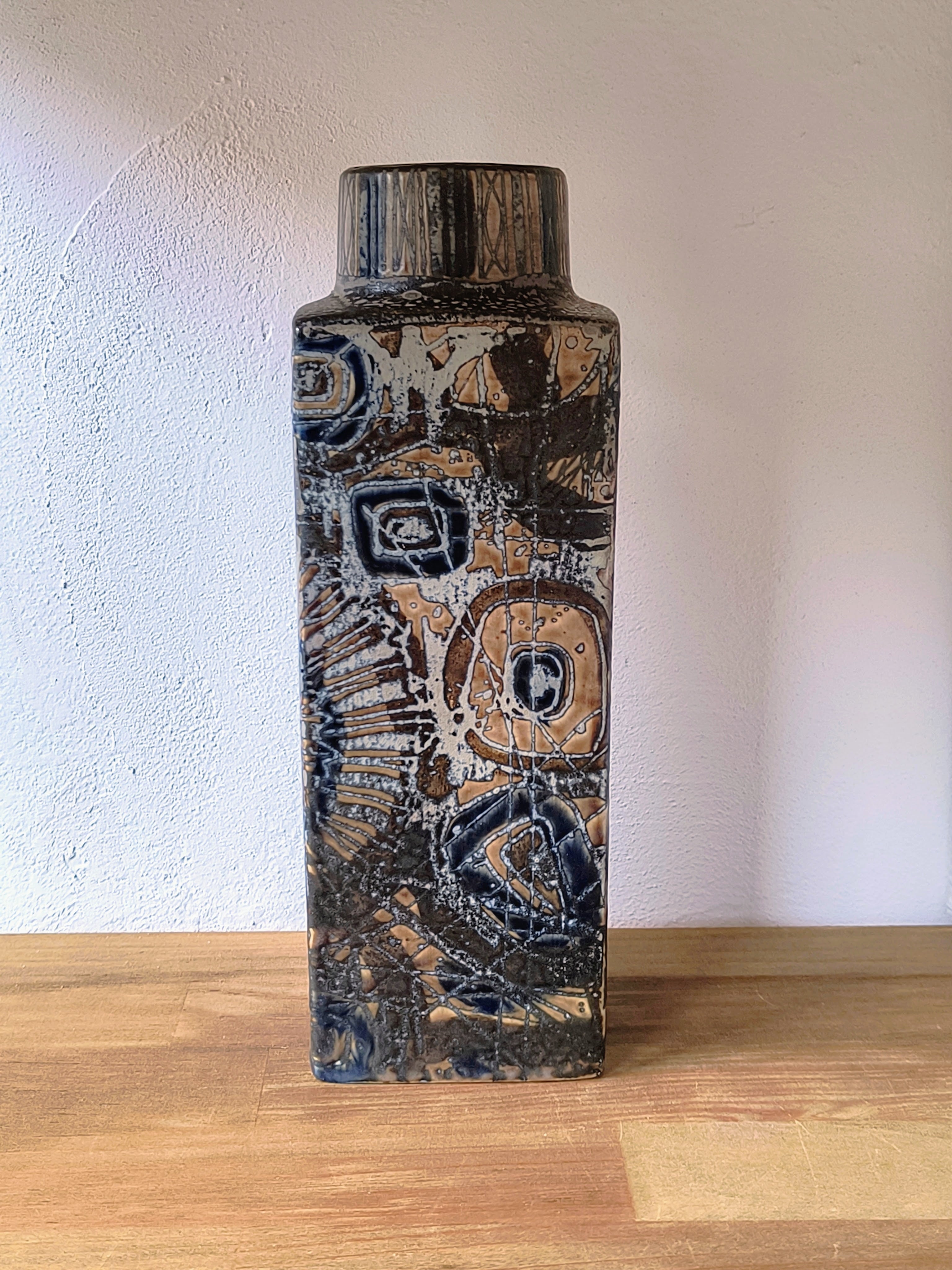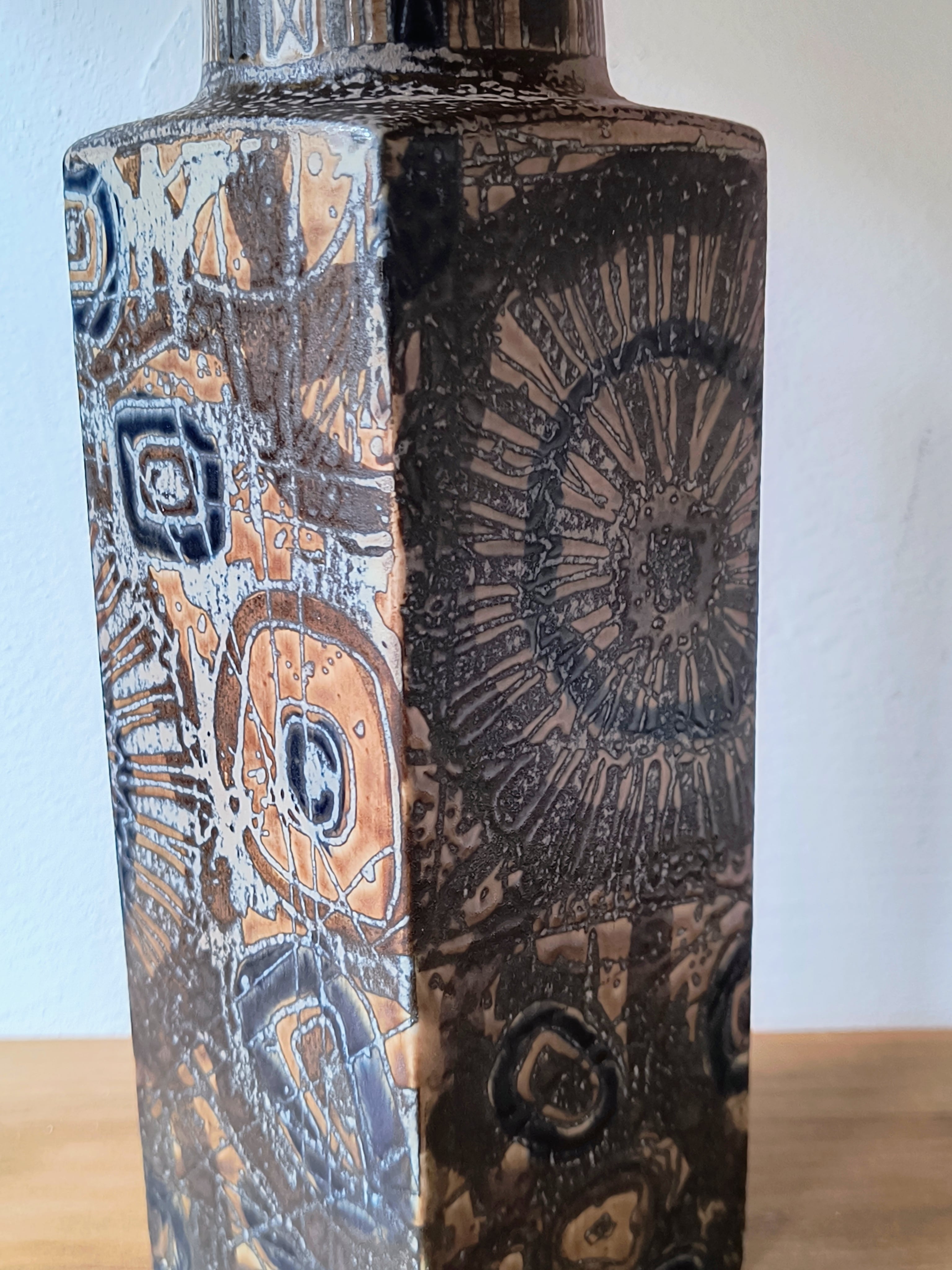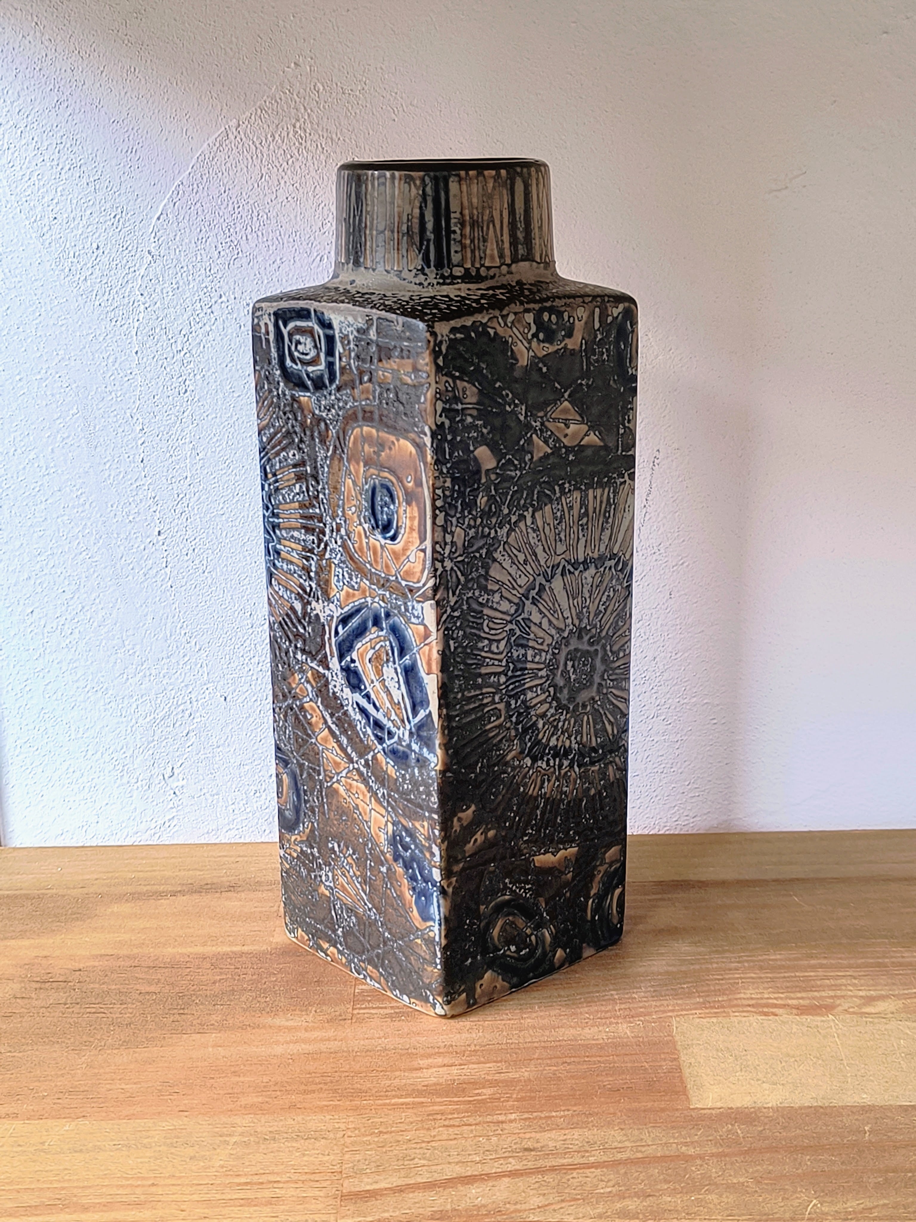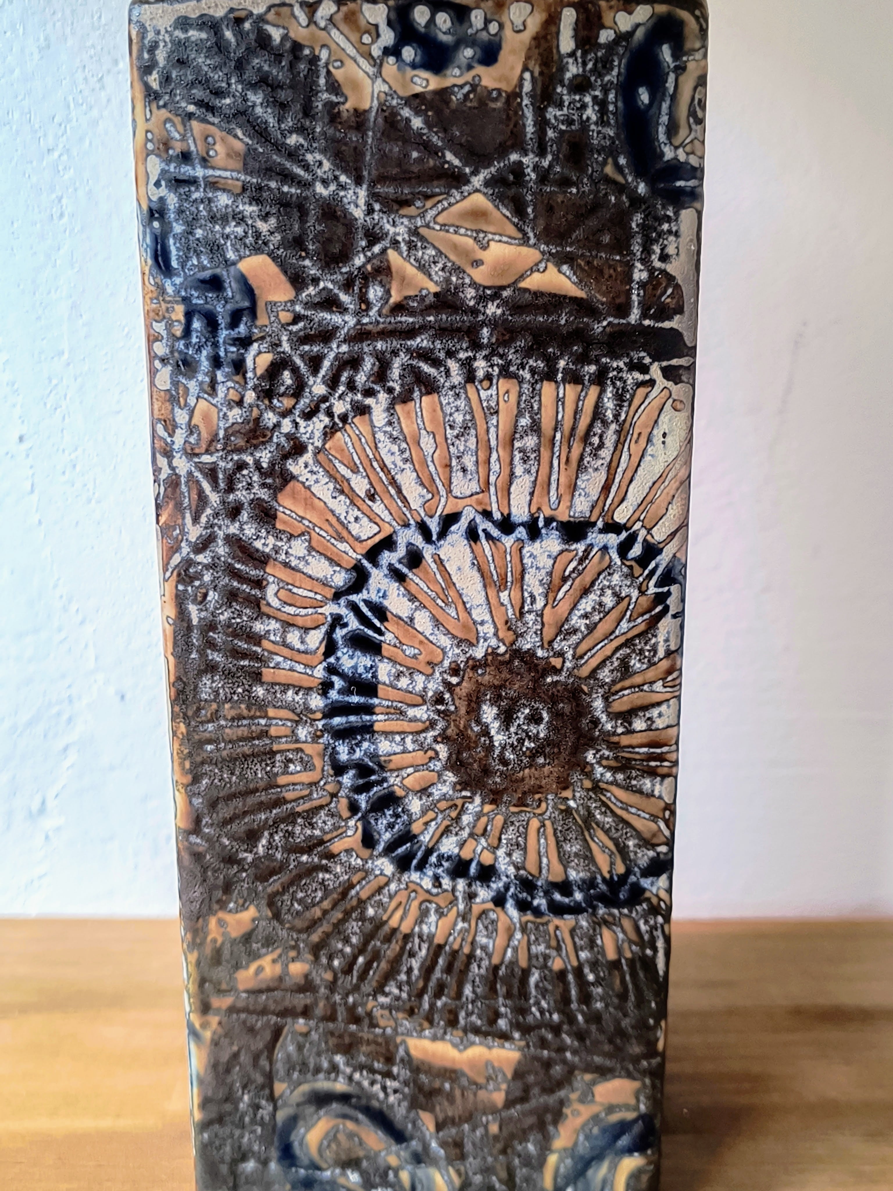 このフラワーベースに描かれたモチーフは、古代の壁画や象形文字を思わせる、力強い抽象的なパターン。素朴な土の質感と、深く釉薬が絡み合った、立体的なレリーフが特徴です。