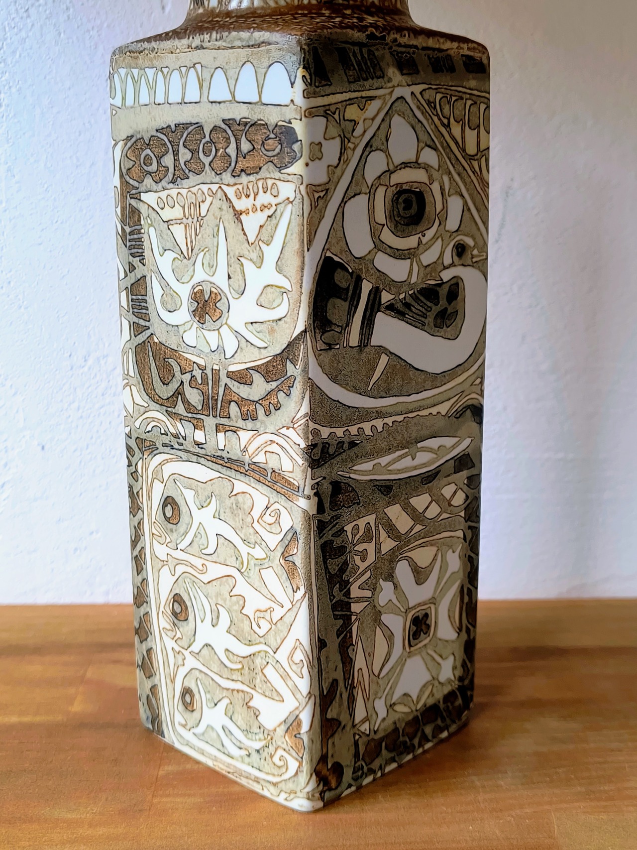 写真に写っているように、鳥や魚、抽象的な植物のモチーフが、あたかも古代の遺跡や神話の世界から掘り起こされたかのように、ベースの四面に力強く刻まれています。