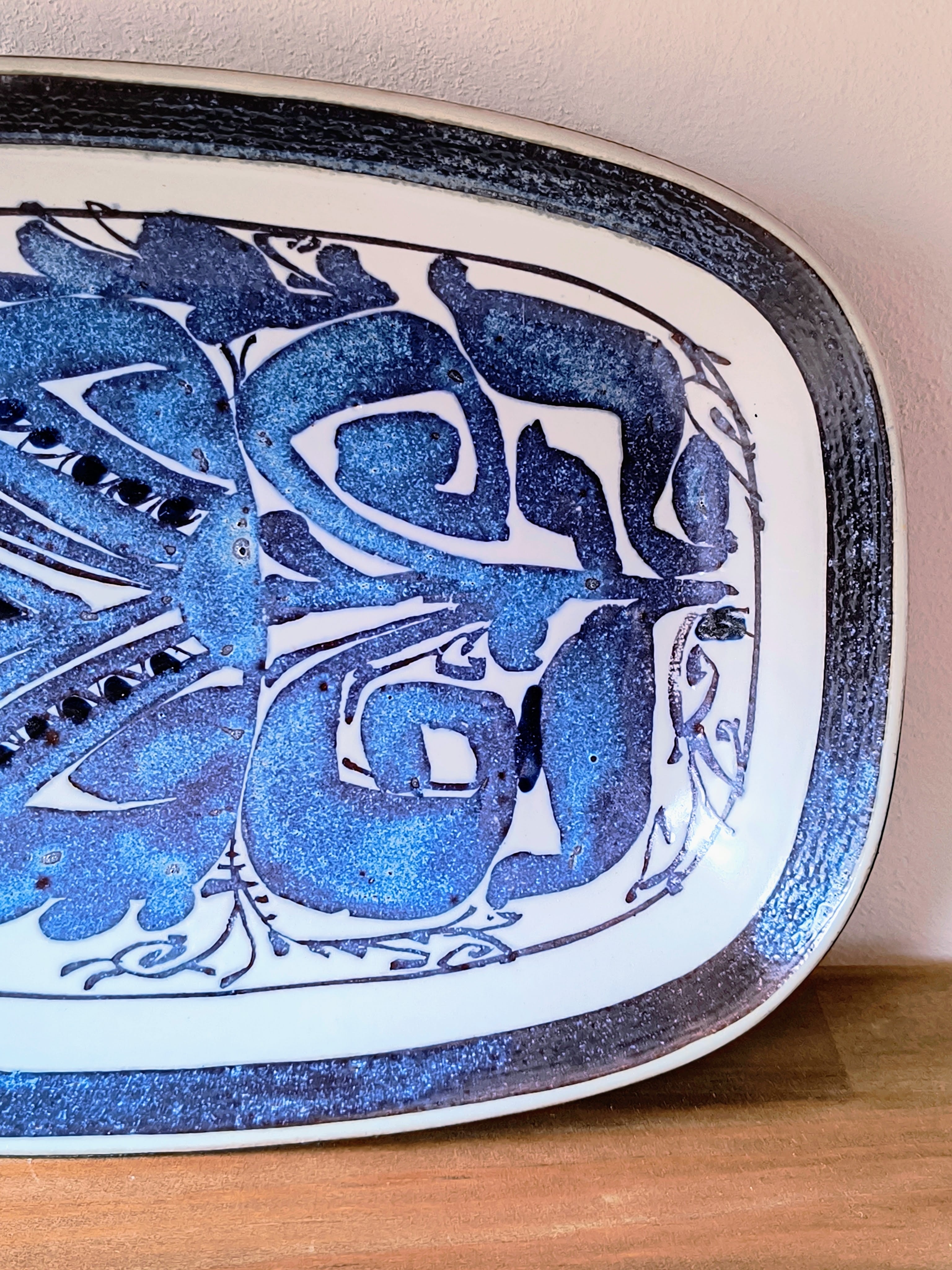 この楕円形プレートには、まさにその若々しく自由な感性が凝縮されています。テネラの特徴である、鮮やかなブルーを基調としながらも、ブラウンやパープルなど、複数の色が複雑に絡み合い、生命力あふれるパターンを形成しています。抽象的なモチーフの中に、時折見える魚や植物のような形が、見る人の想像力を刺激します。