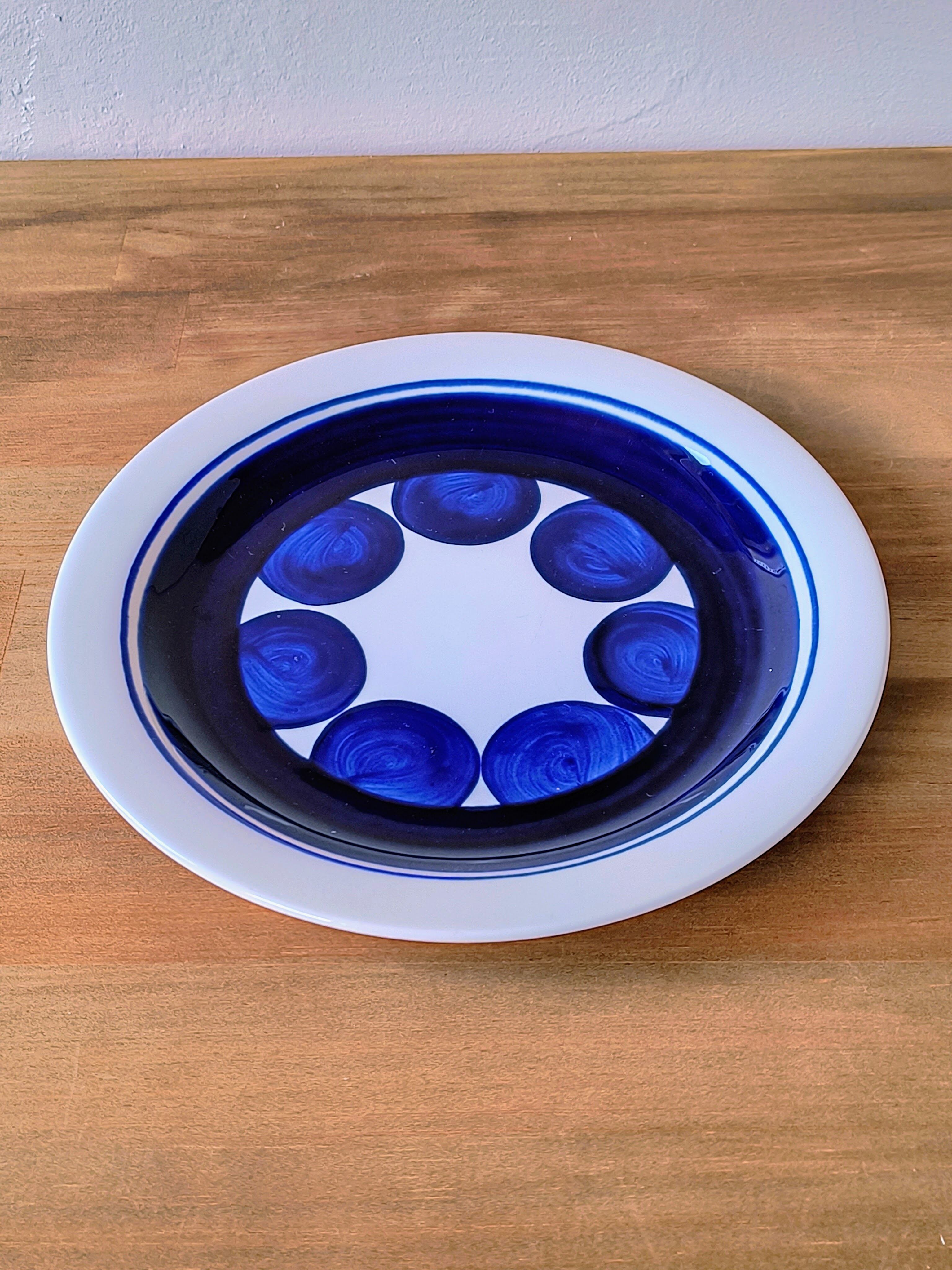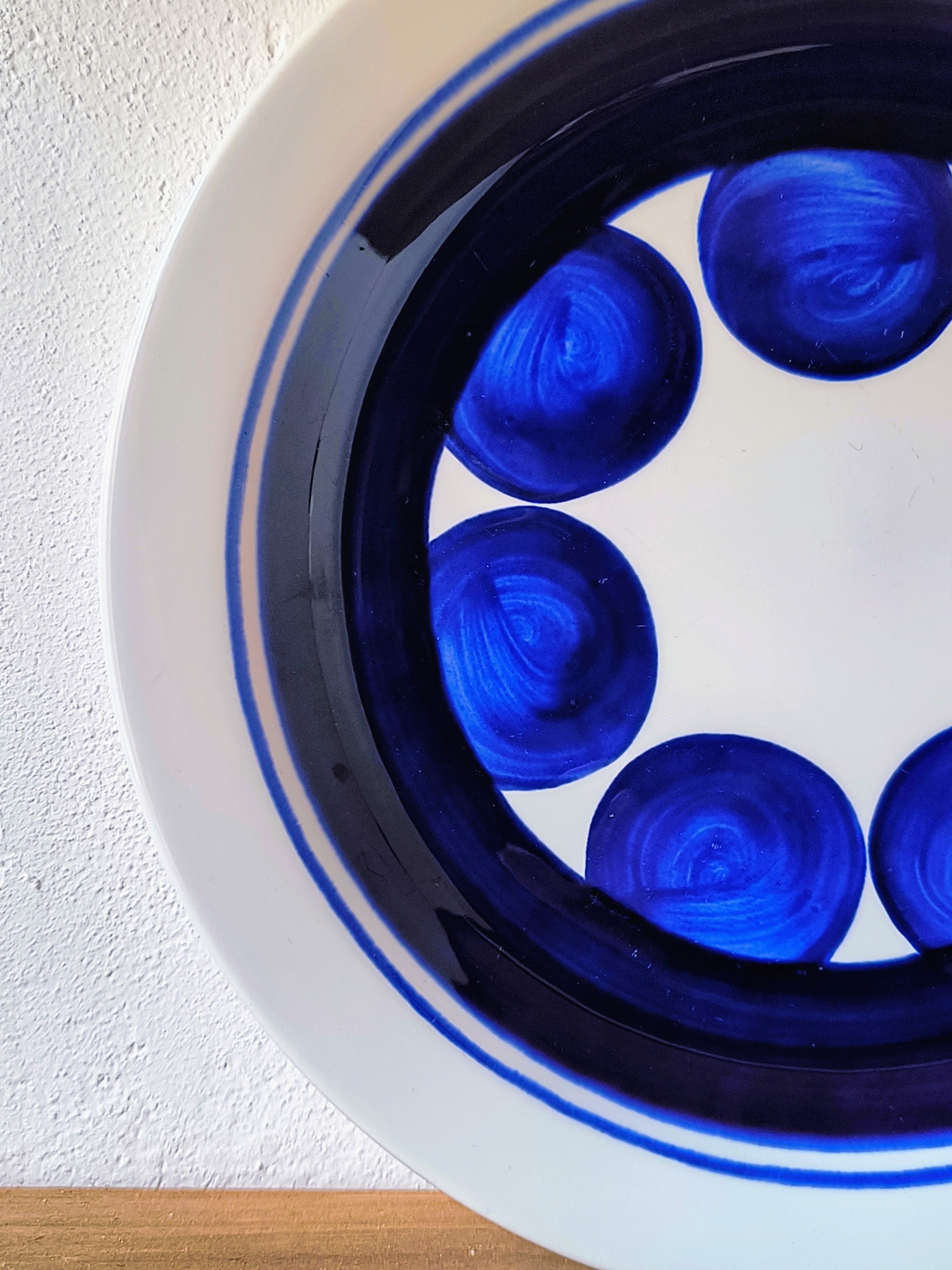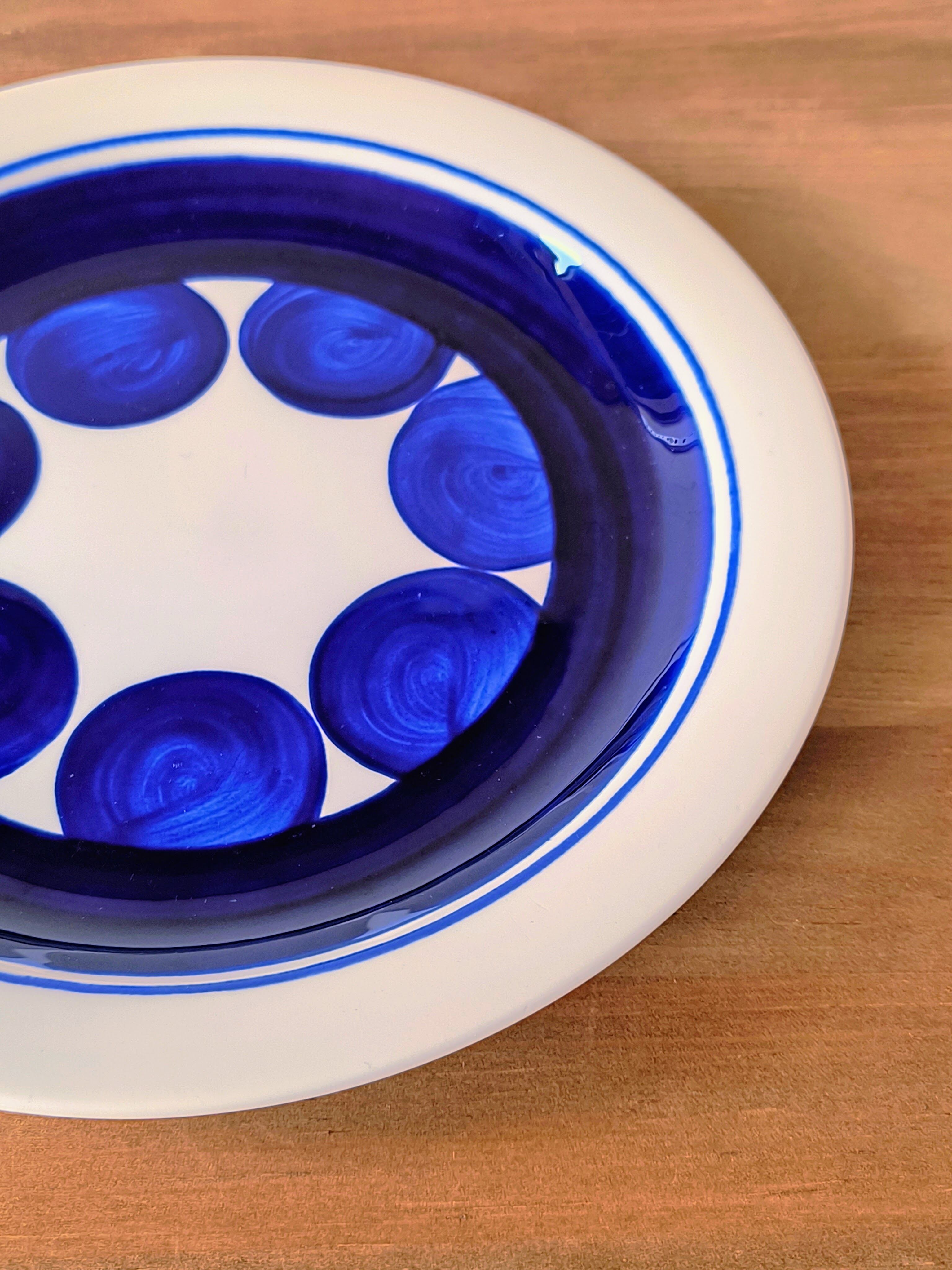 このプレートは、白地の磁器をキャンバスに、コバルトブルーの丸いモチーフがリズミカルに配置されたデザインが特徴です。