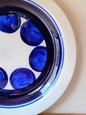 しかし、このプレートの価値は機能性だけではありません。鮮やかな青と白の潔いコントラストは、テーブルに置くだけで、空間に確かなデザインの力を加えてくれます。