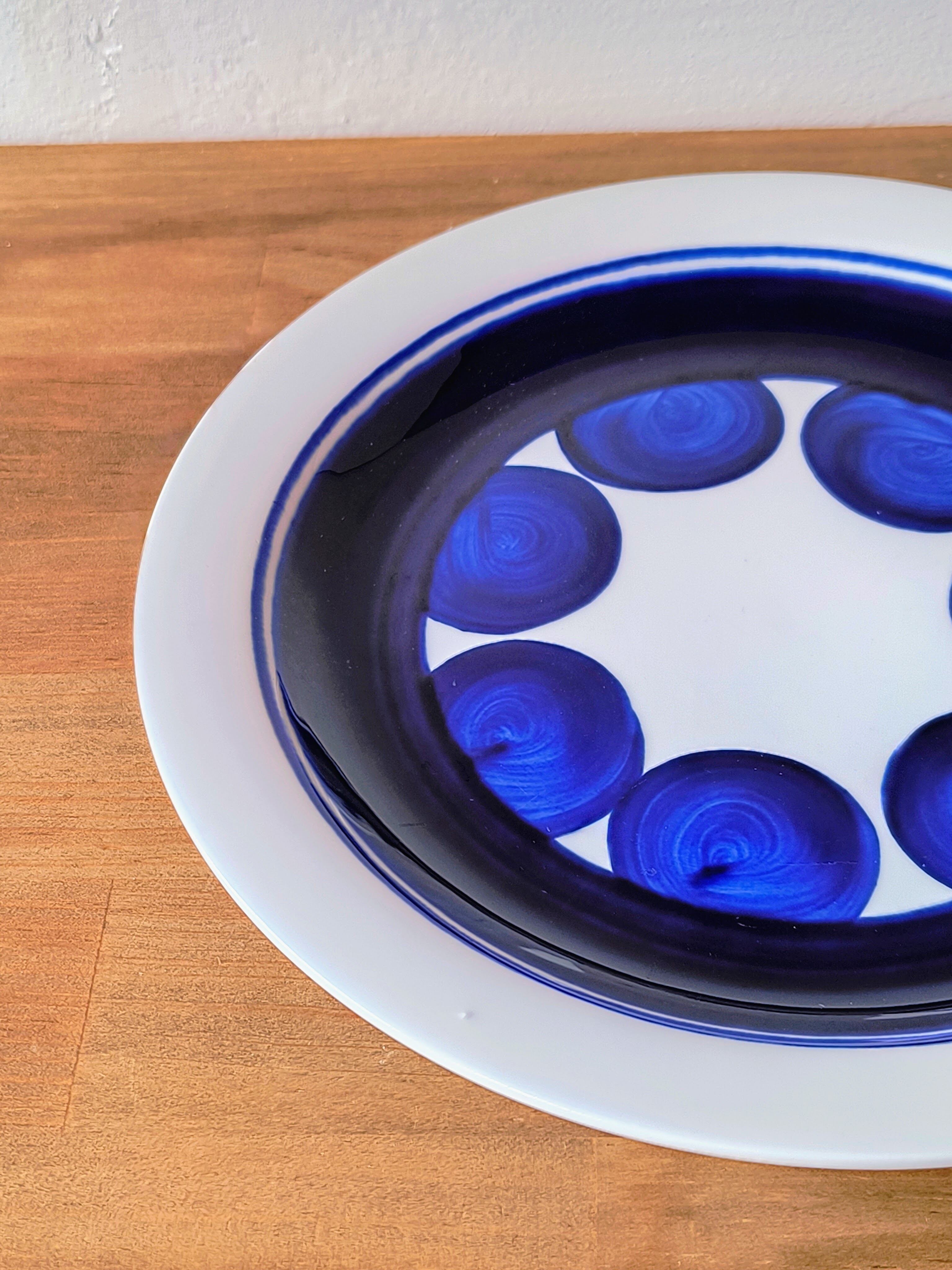 このプレートは、白地の磁器をキャンバスに、コバルトブルーの丸いモチーフがリズミカルに配置されたデザインが特徴です。