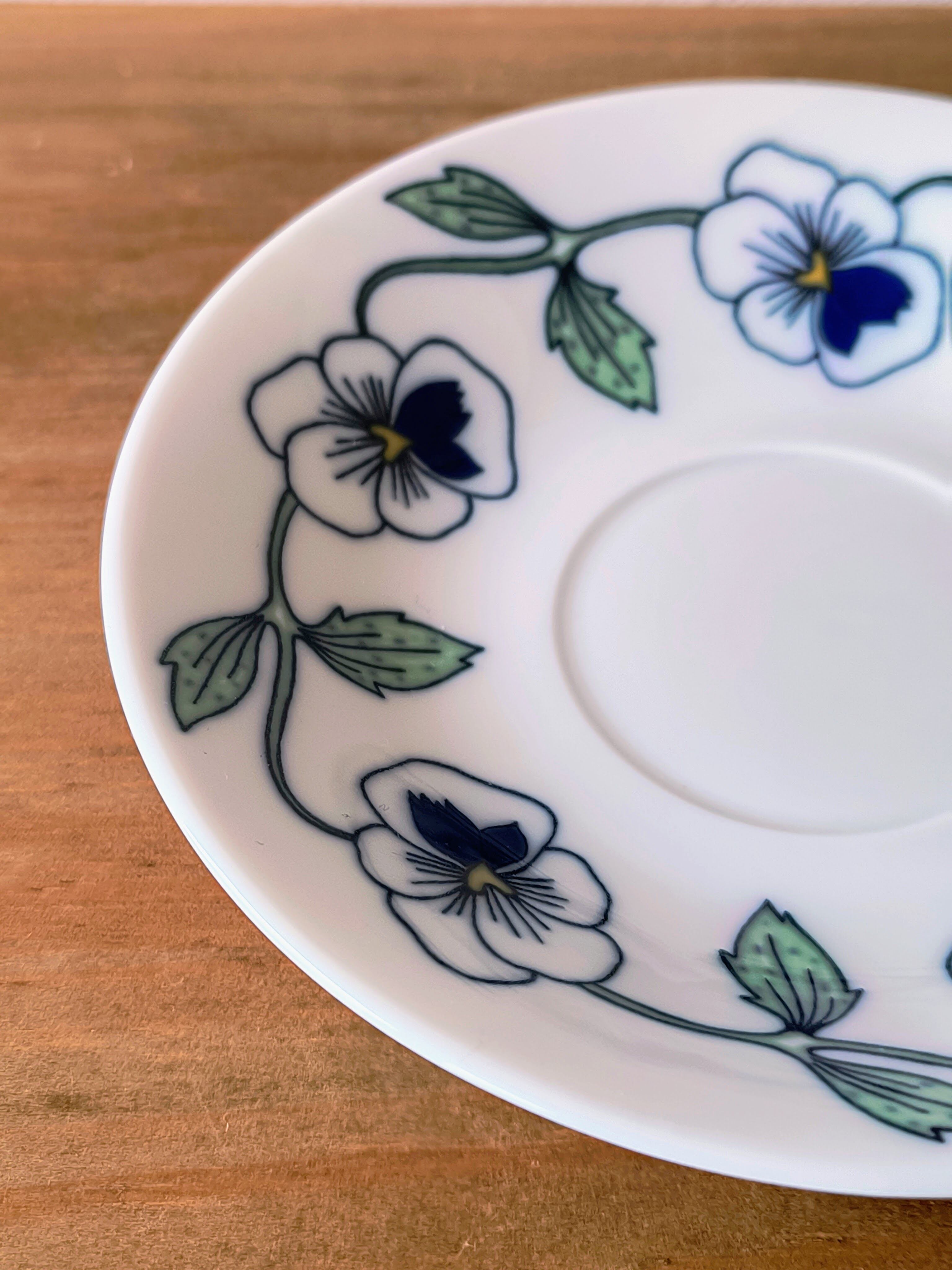 カップ、ソーサー、プレートの全てに、異なる配置でパンジーのモチーフが描かれており、揃えて並べたときのハーモニーが非常に美しいです。