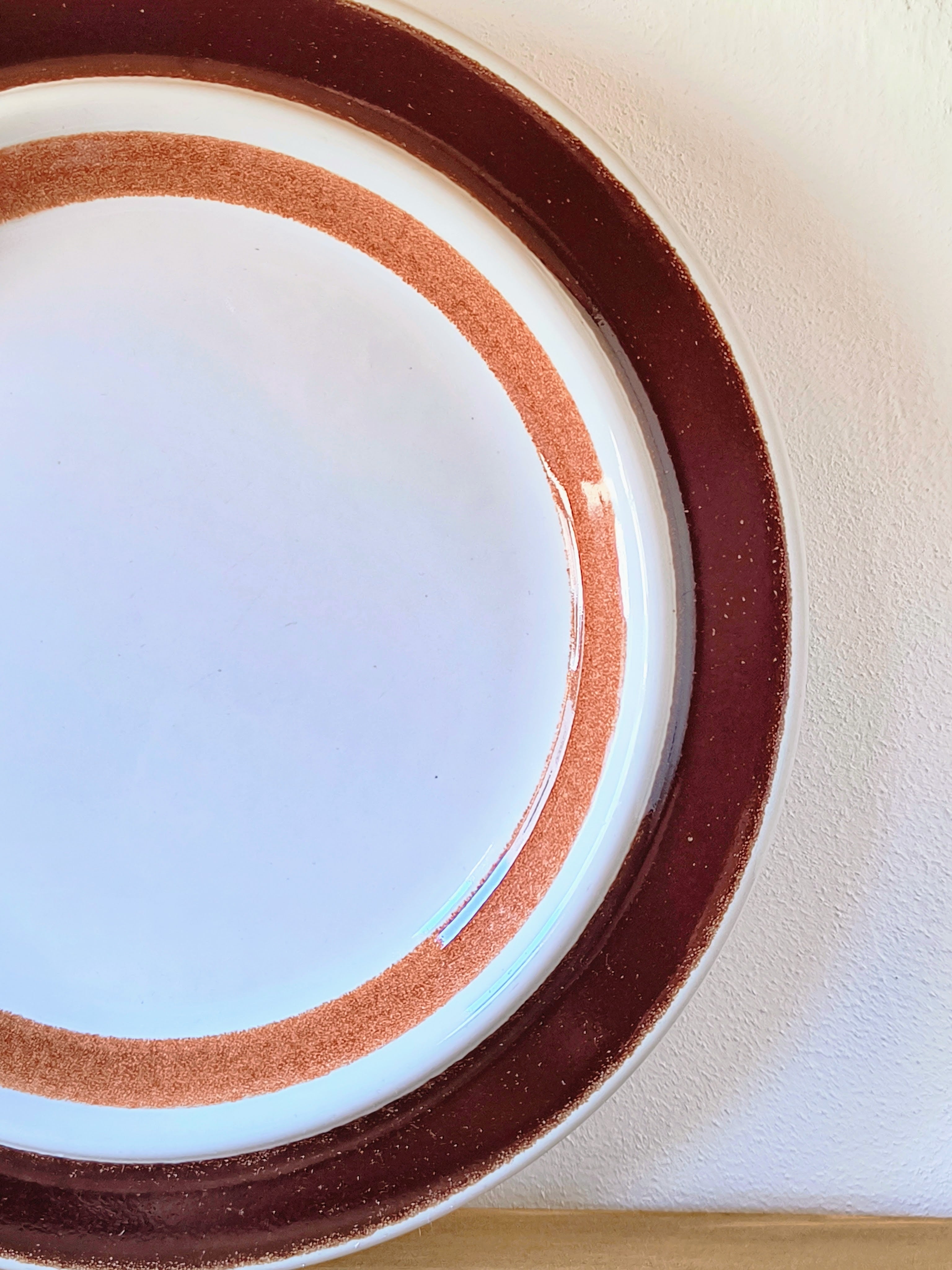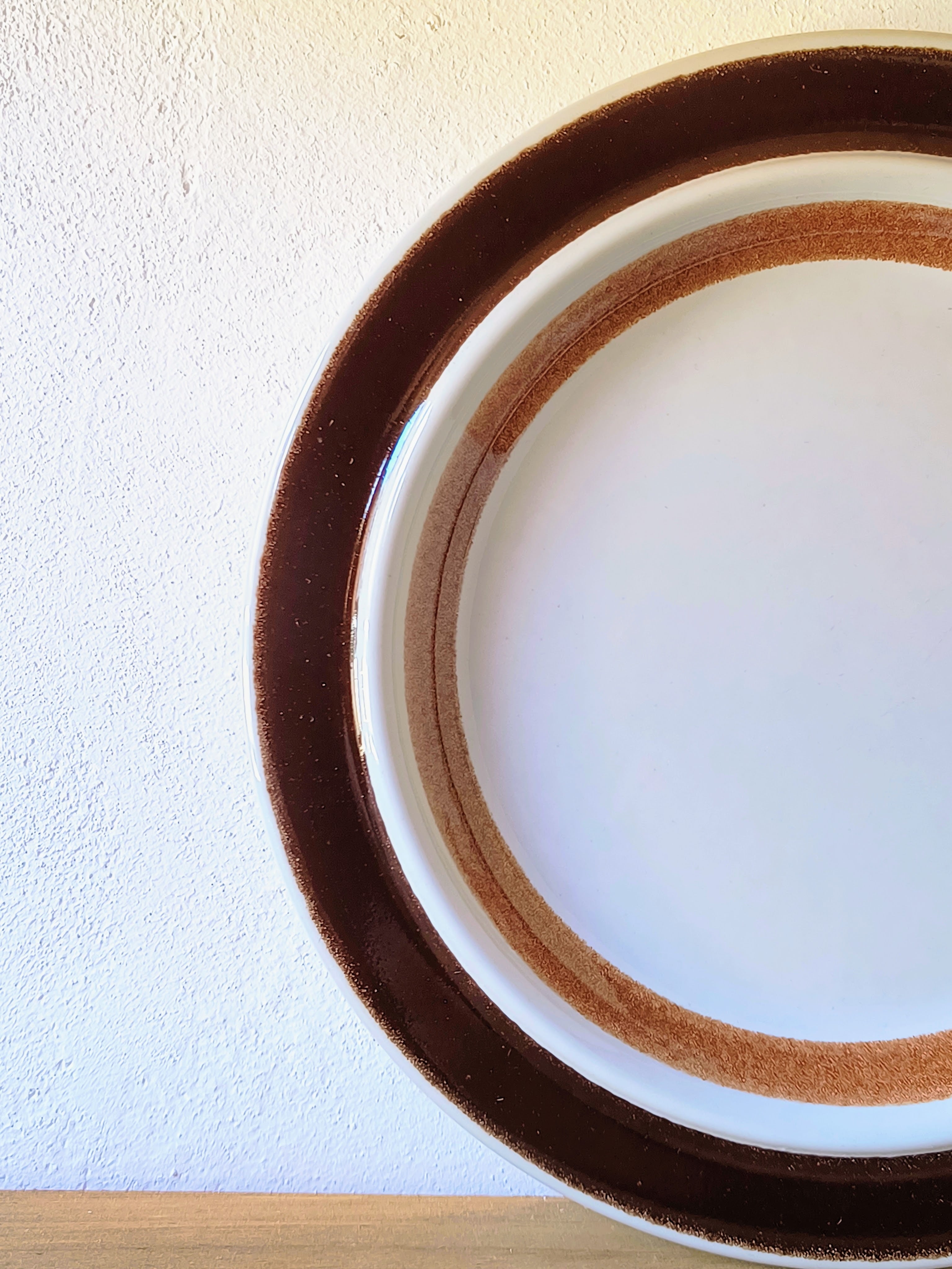 デザインの特徴は、職人の手仕事によって施された深いブラウンのラインです。Rosmarin(ローズマリー)特有の温かみのある茶色の染料を用い、ハンドペイントならではの筆致が感じられる太い帯状のラインと、繊細な細いラインが組み合わされています。