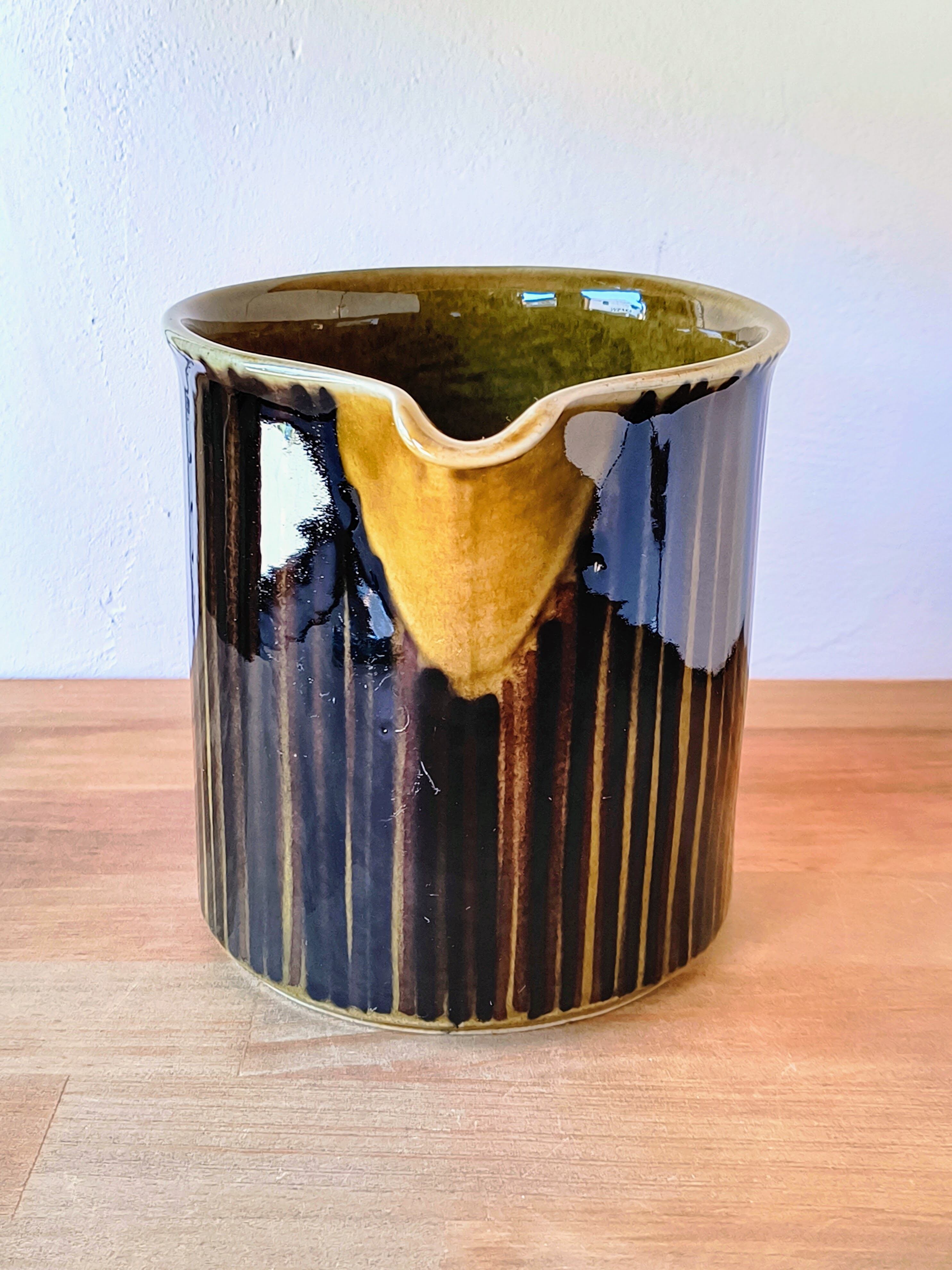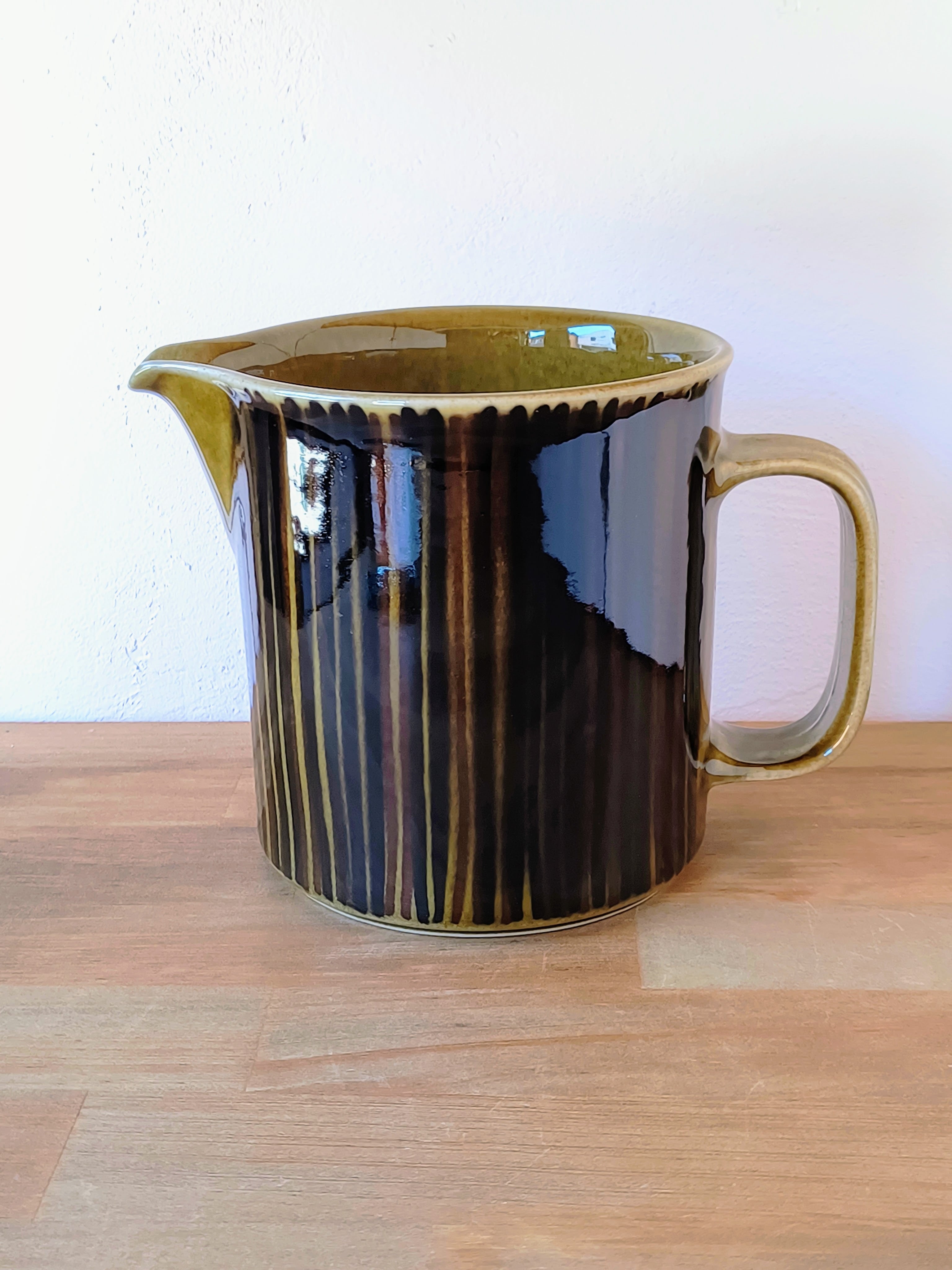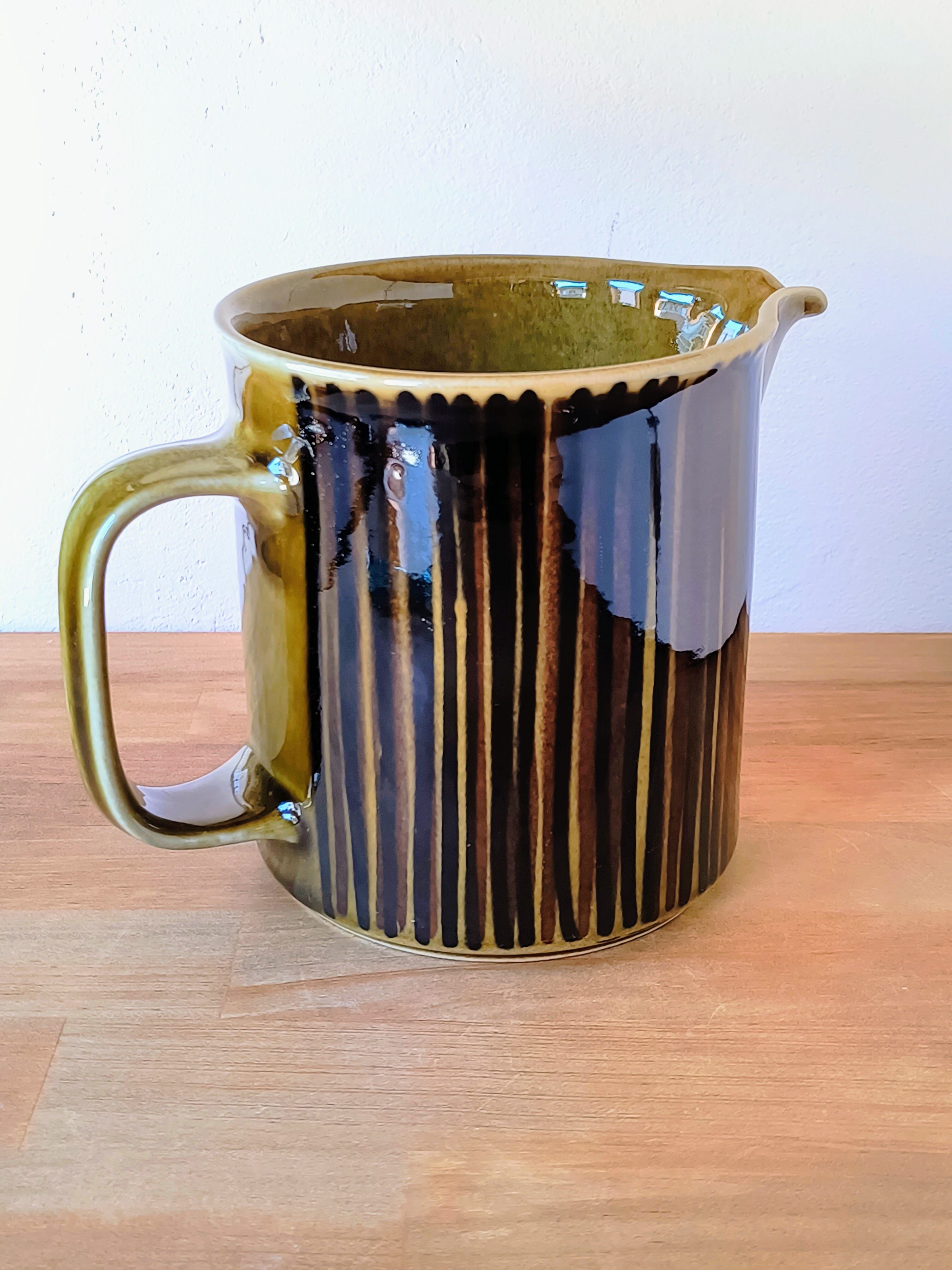 これらのラインは職人の手作業によって一本一本描き入れられており、ハンドペイントならではの筆致や、釉薬の重なりによる色の濃淡が絶妙な風合いを生み出しています。落ち着いたオリーブグリーンとブラウンの色彩は、当時のフィンランドのデザインが持っていた、自然への敬愛とクラフトマンシップの融合を感じさせます。