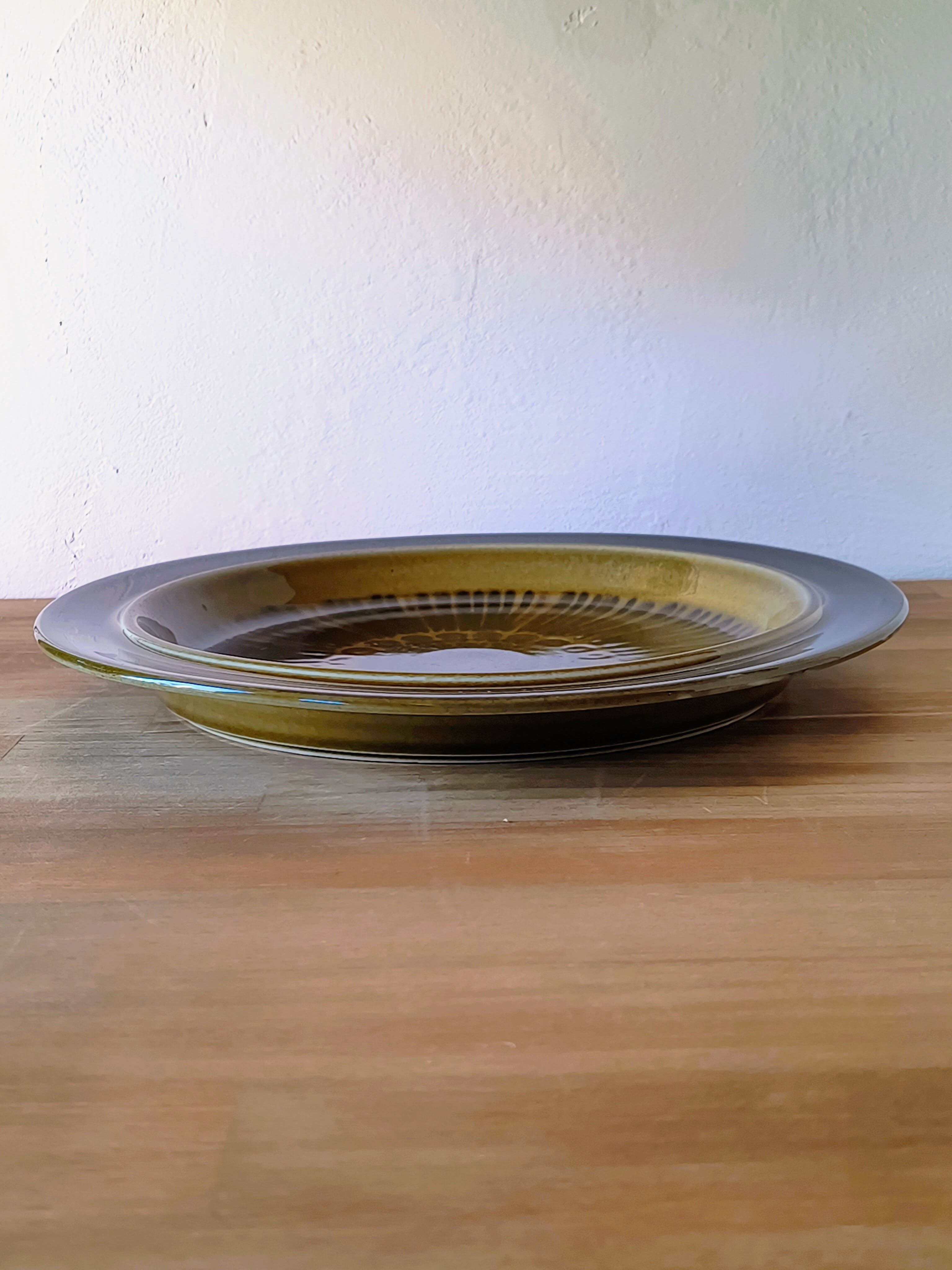 オリーブグリーンやブラウンの釉薬が重なり合うことで、ハンドペイントならではの色の濃淡や奥行きのある表情が生まれています。