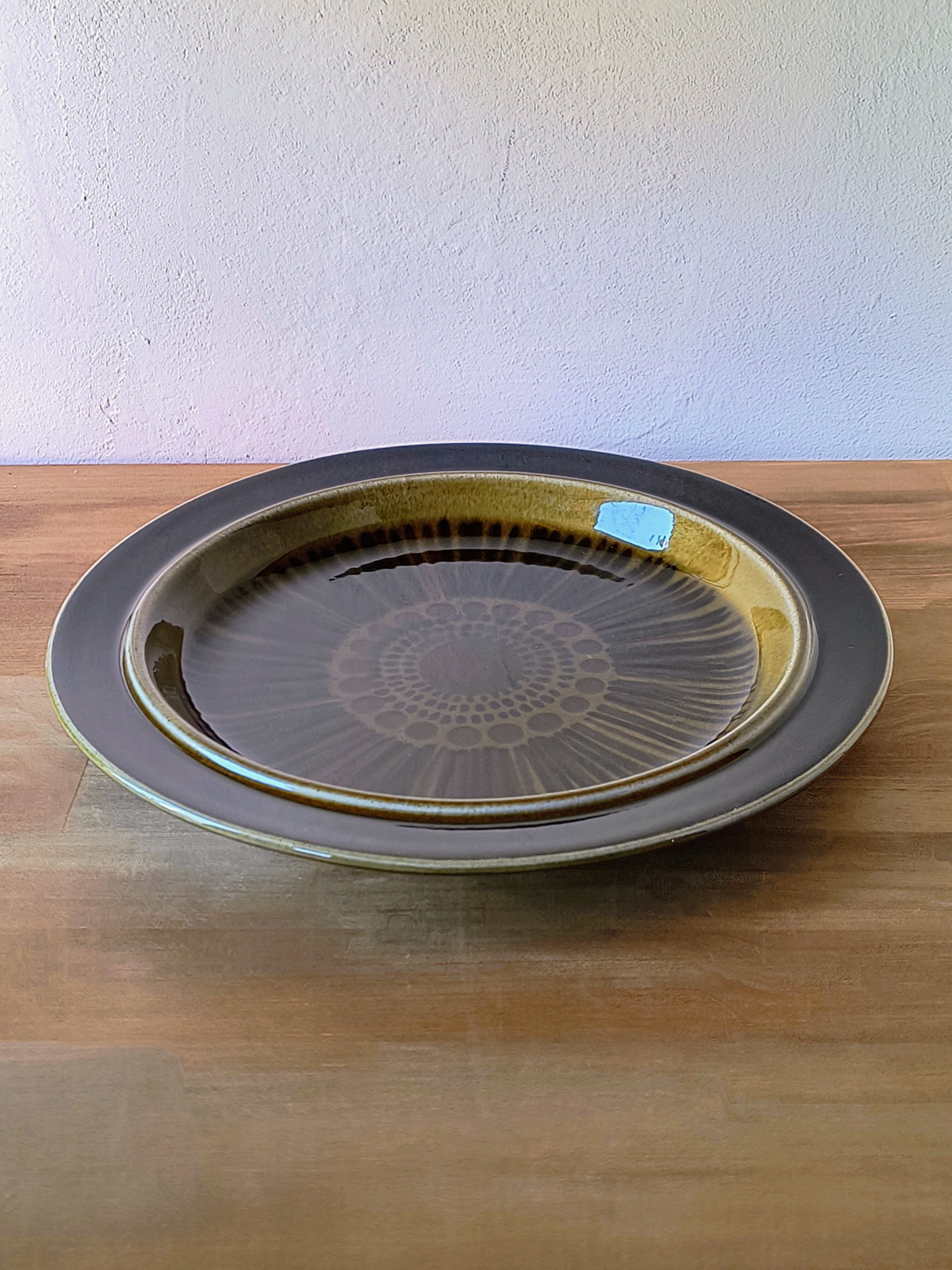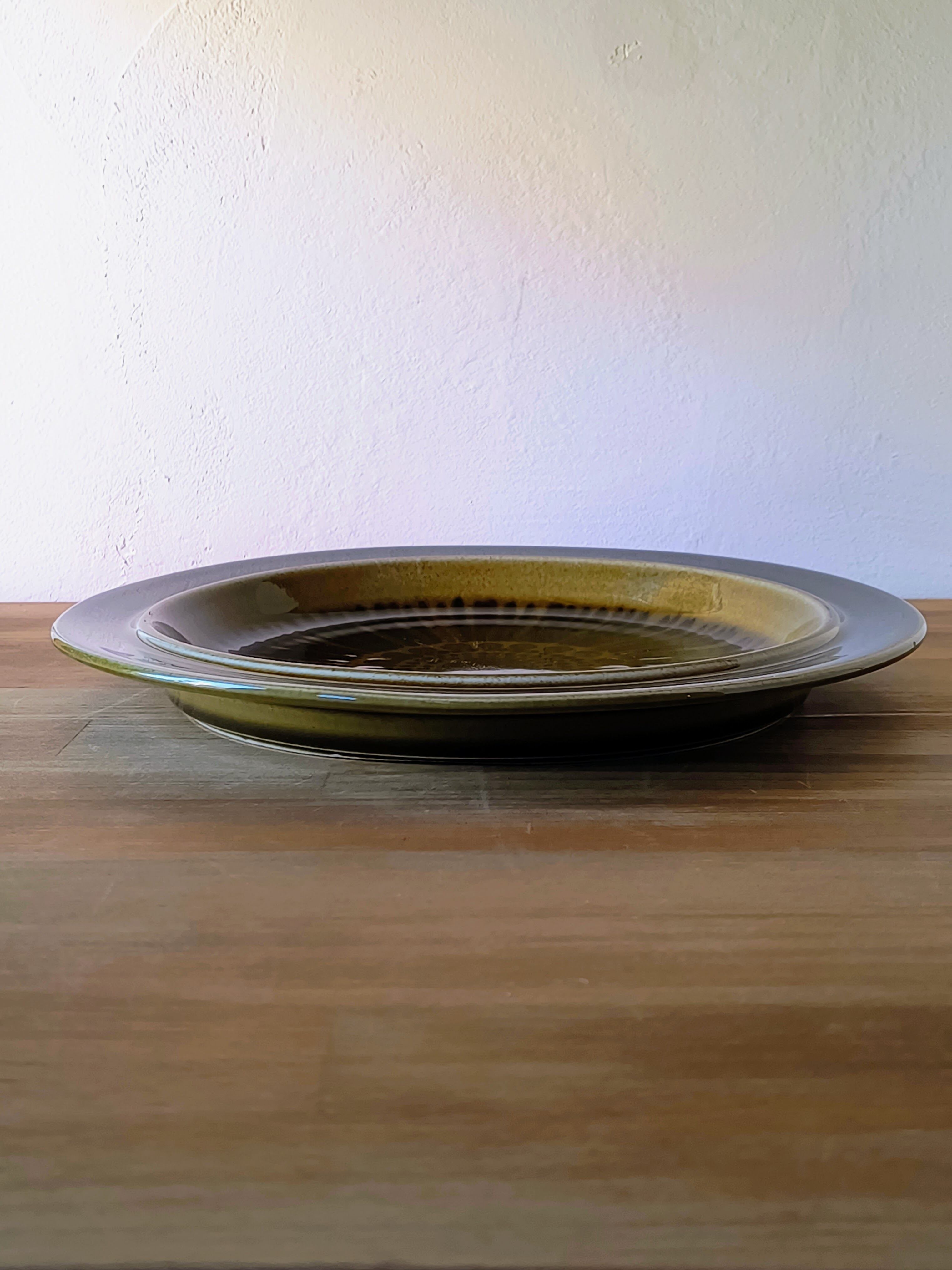 オリーブグリーンやブラウンの釉薬が重なり合うことで、ハンドペイントならではの色の濃淡や奥行きのある表情が生まれています。