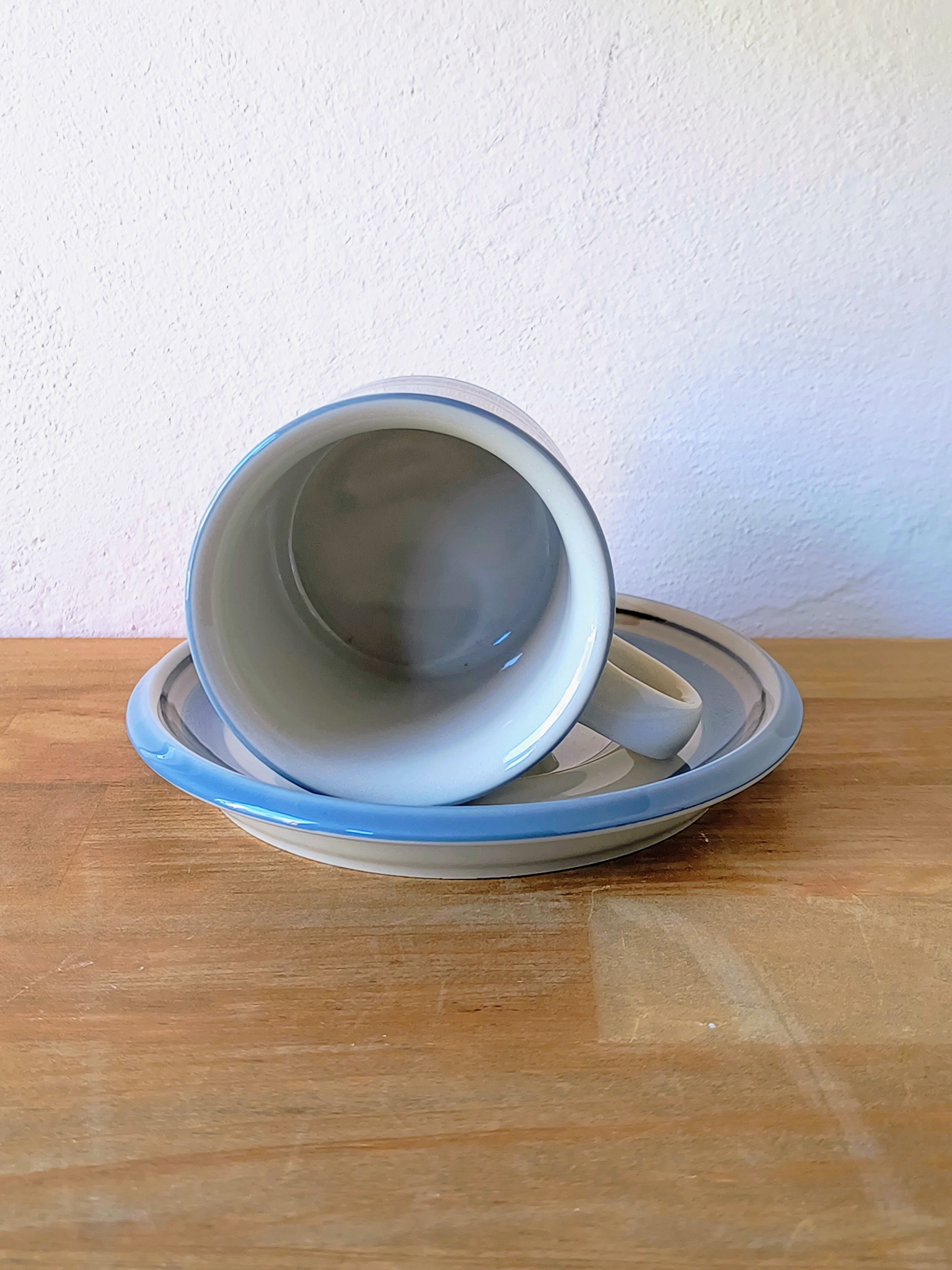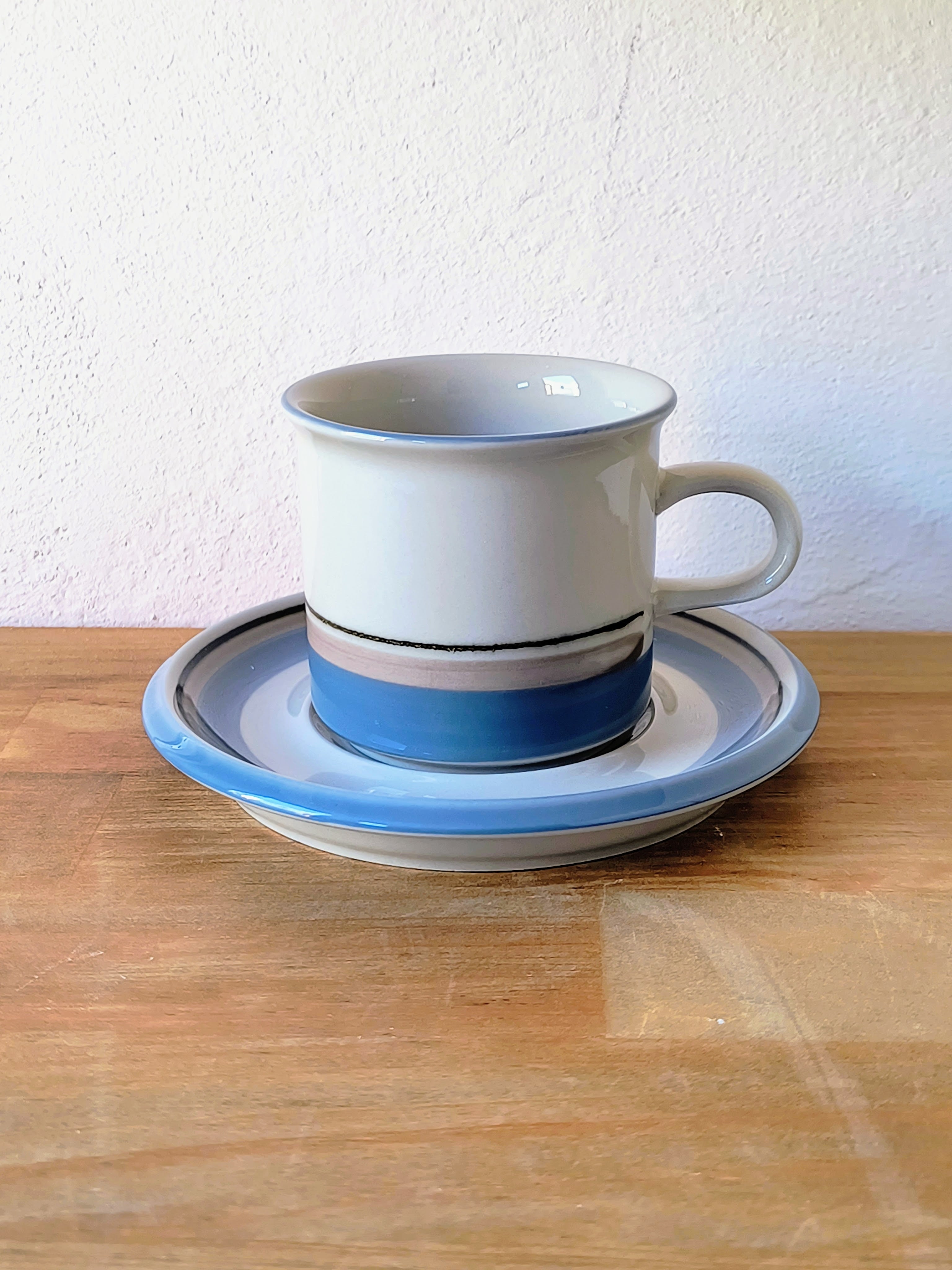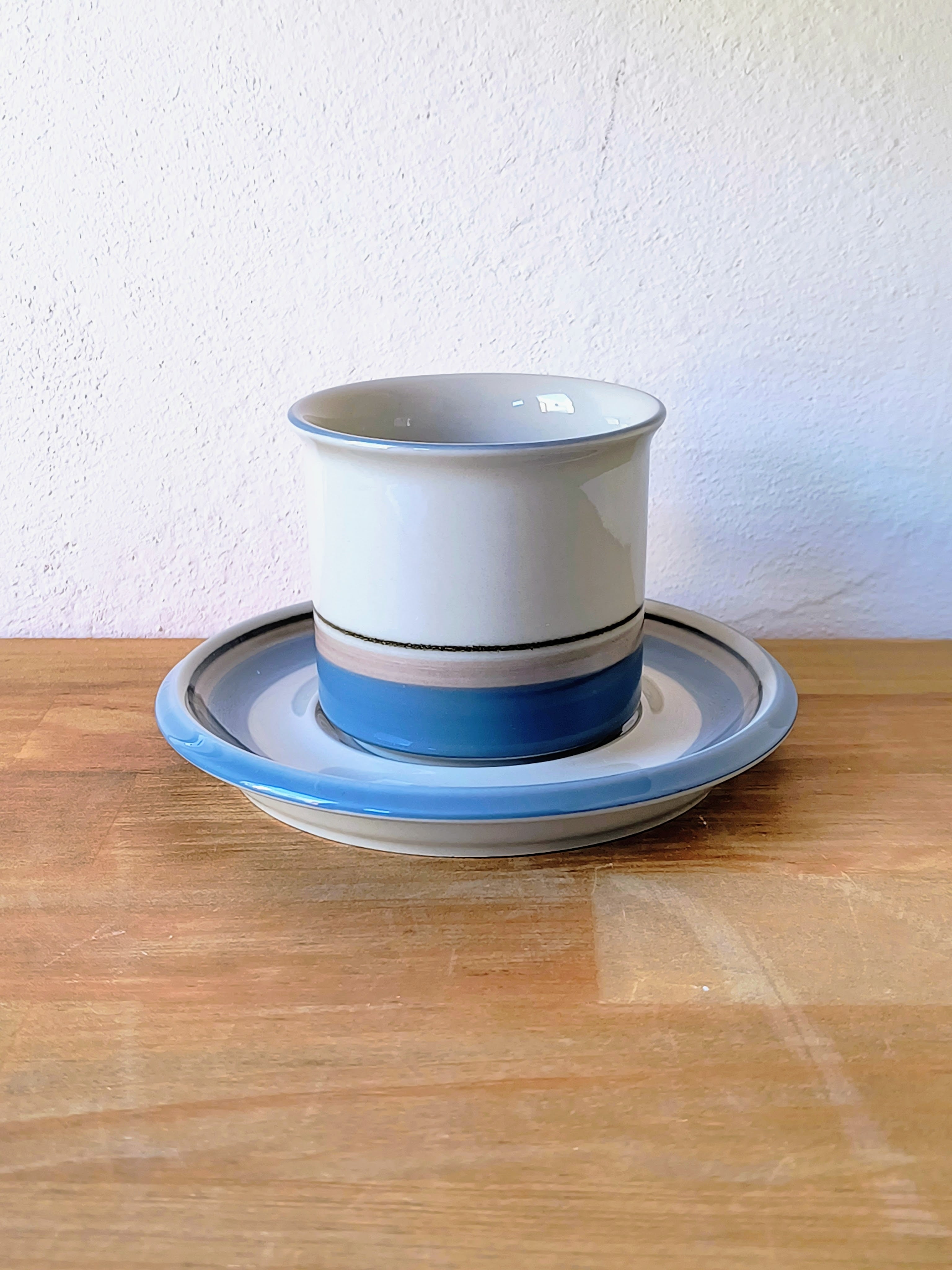 1982年から1999年まで製造された本シリーズは、水辺を連想させる静謐なデザインが特徴です。落ち着いたベージュの地色に、淡いブルー、グレー、そしてブラックの細いラインが水平に描かれており、北欧の穏やかな自然風景を象徴するようなミニマルで洗練された印象を与えます。
