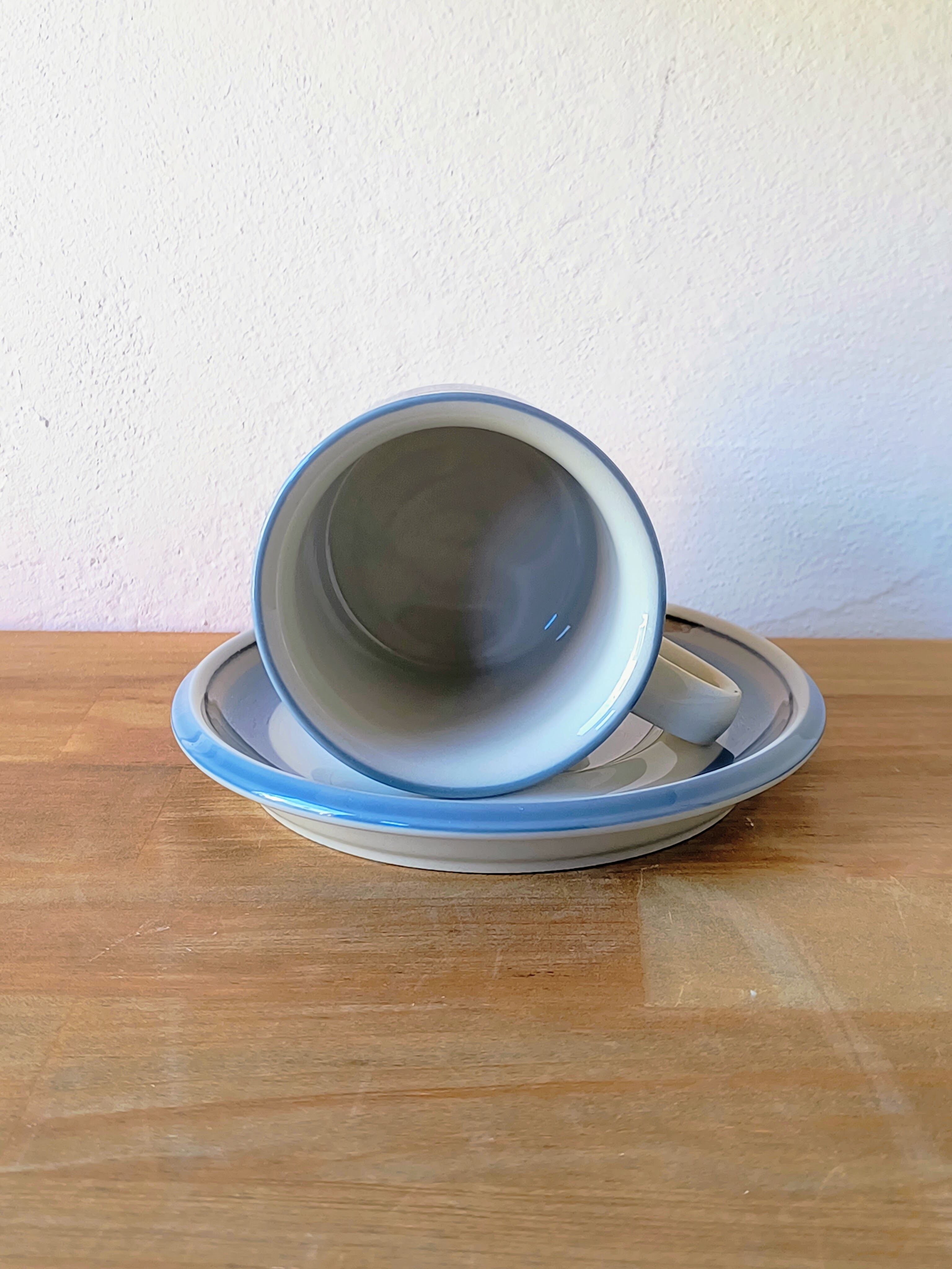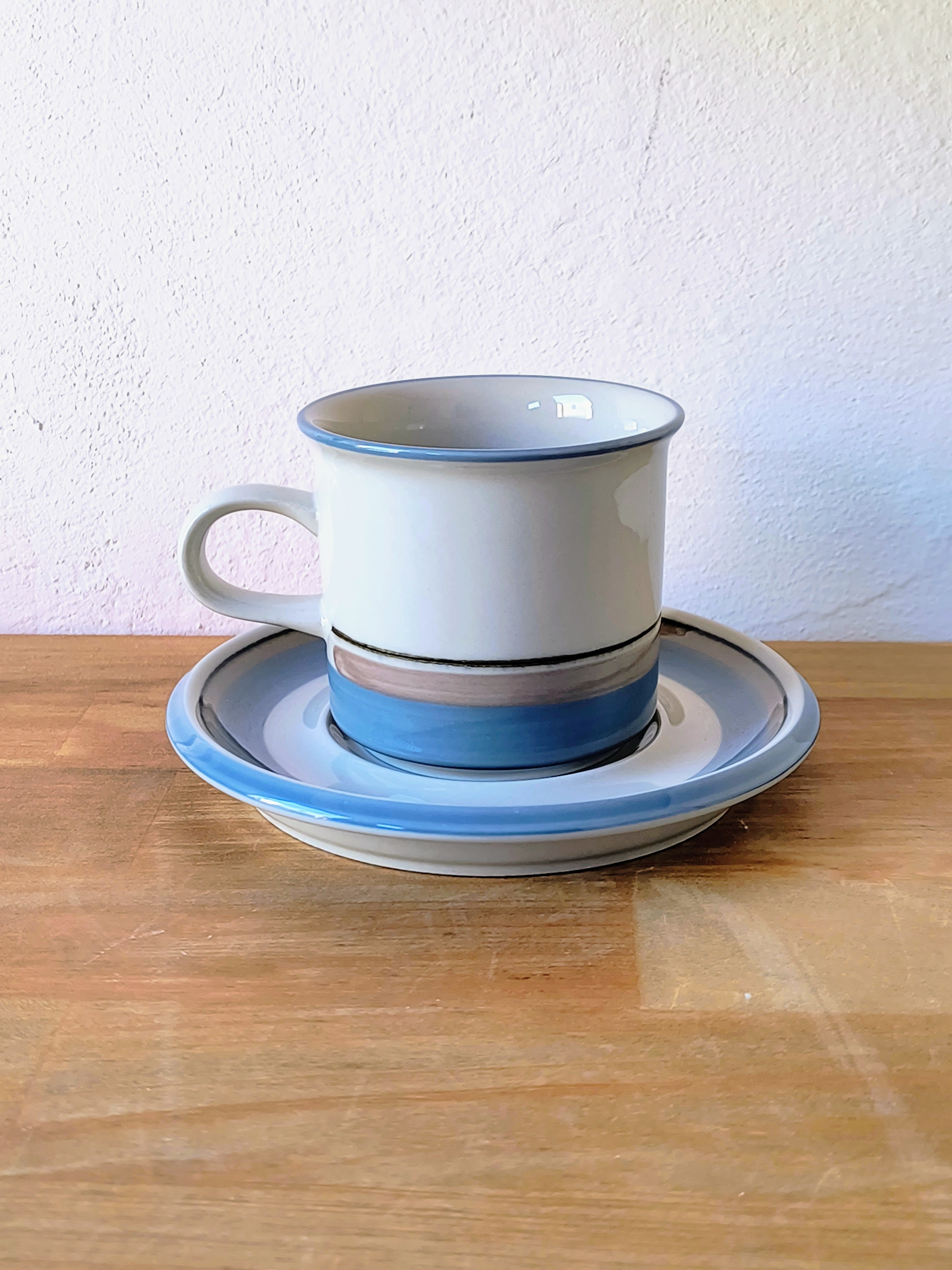 1982年から1999年まで製造された本シリーズは、水辺を連想させる静謐なデザインが特徴です。落ち着いたベージュの地色に、淡いブルー、グレー、そしてブラックの細いラインが水平に描かれており、北欧の穏やかな自然風景を象徴するようなミニマルで洗練された印象を与えます。