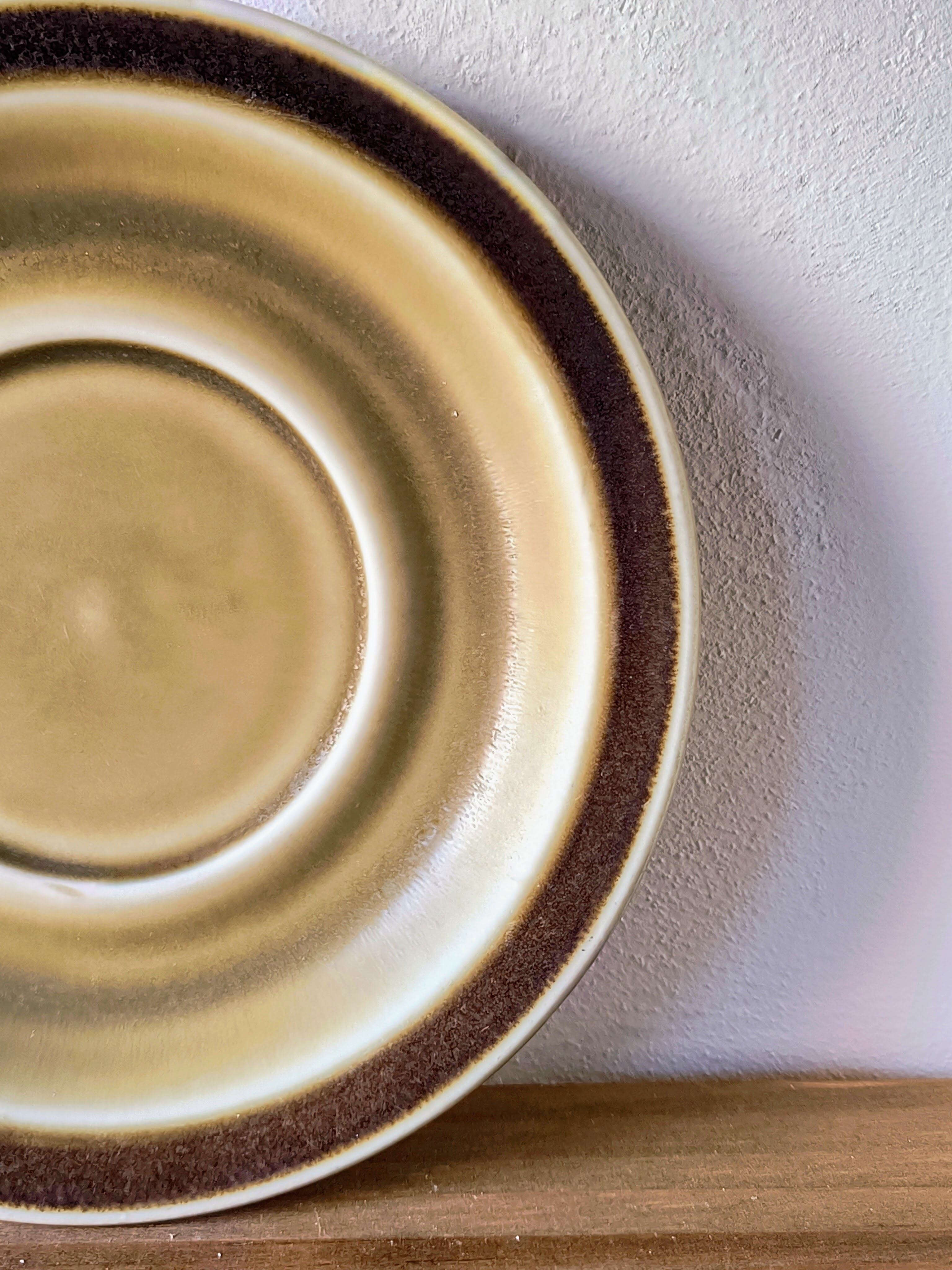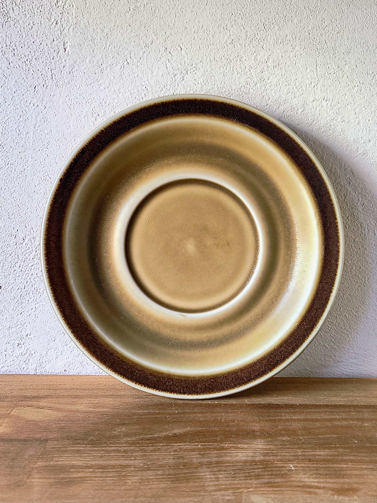 中央から外側に向かって刻まれた繊細なラインが、光を受けることで豊かな陰影を生み出します。深いブラウンの釉薬は、焼き上がりの条件によって一点ごとに濃淡が異なり、釉薬が溜まった部分の艶やかな質感と、エッジ部分の明るい発色のコントラストがヴィンテージ特有の奥深い表情を見せてくれます。