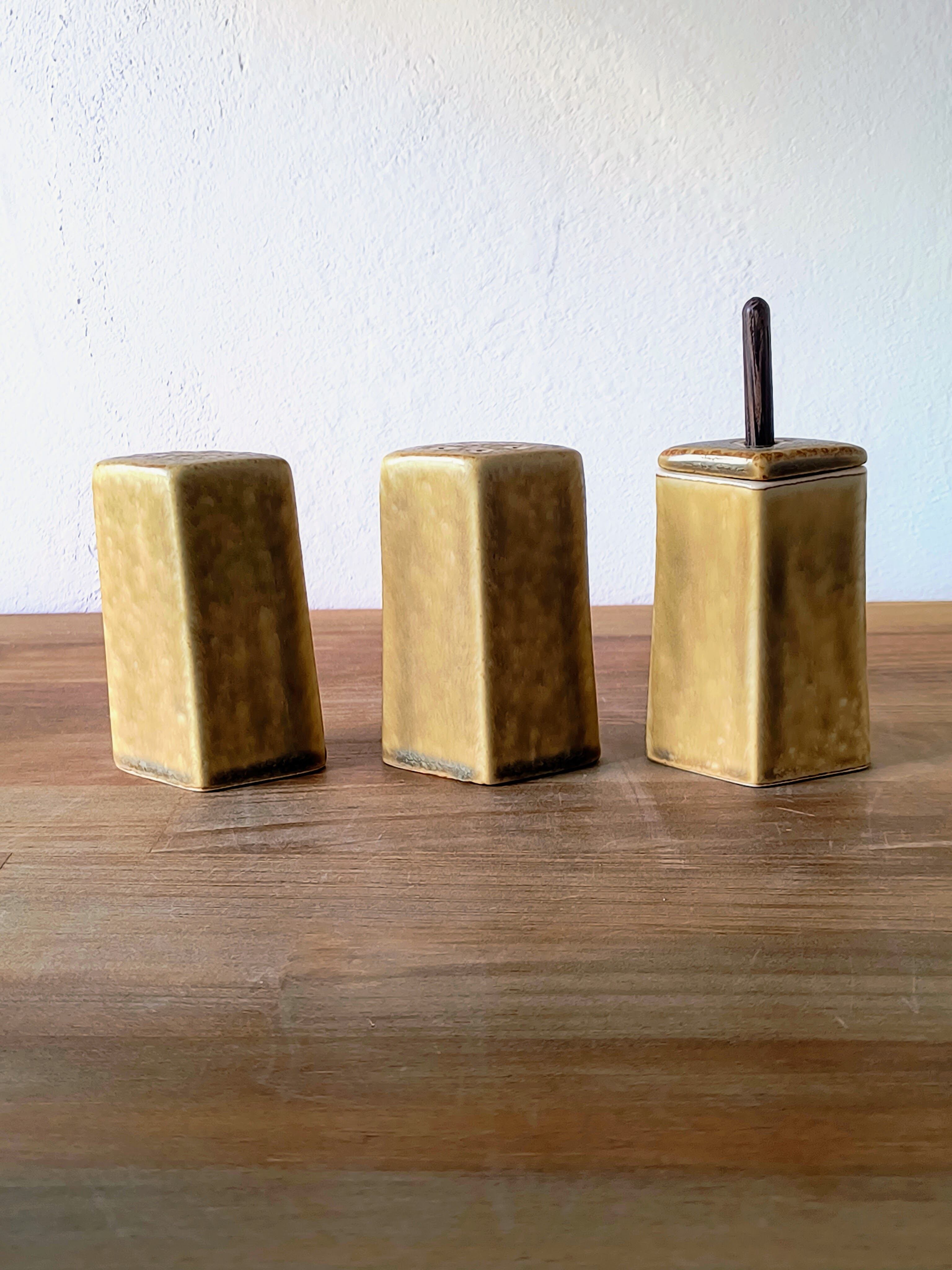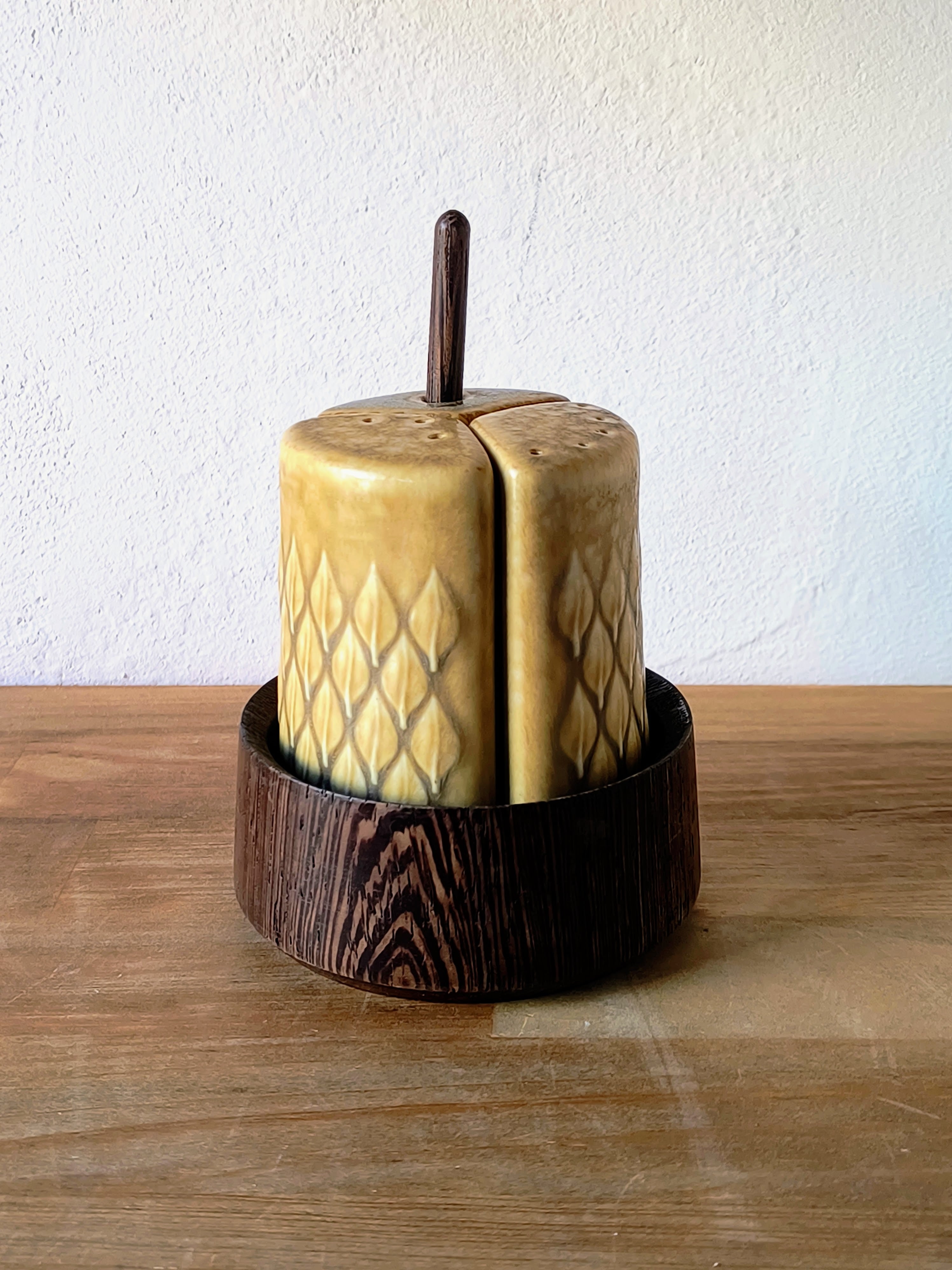 1950年代後半から製造が開始されたこのシリーズは、Kronjyden(クロニィデン)、Nymolle(ニモール)、Bing & Grondahl(ビン・オー・グレンダール)の3社に渡って作り続けられた、デンマーク・デザインの金字塔ともいえる作品です。なかでもこのスパイスホルダーは、当時の食卓を彩る機能的な小物として、多くの家庭で愛用されました。